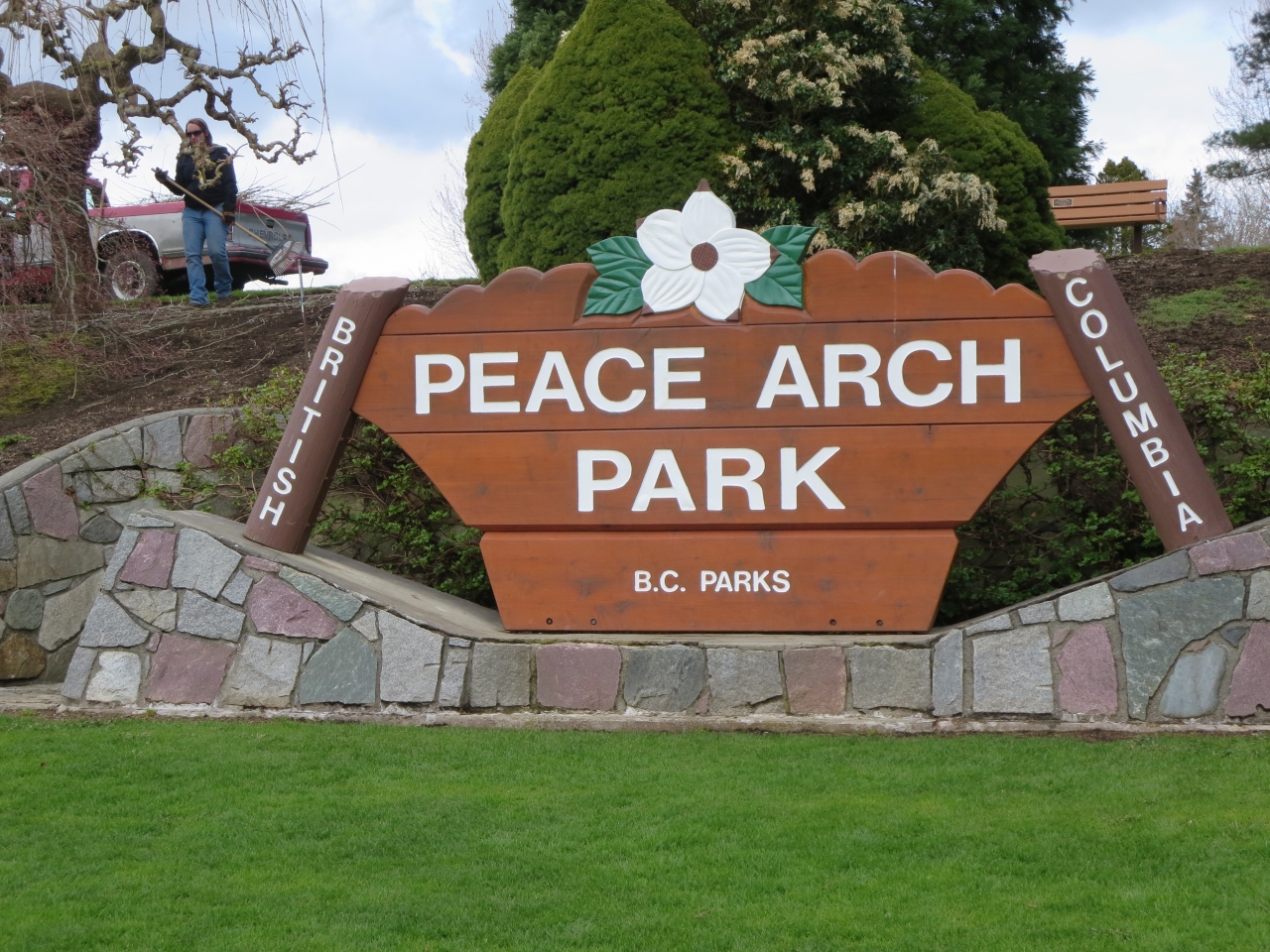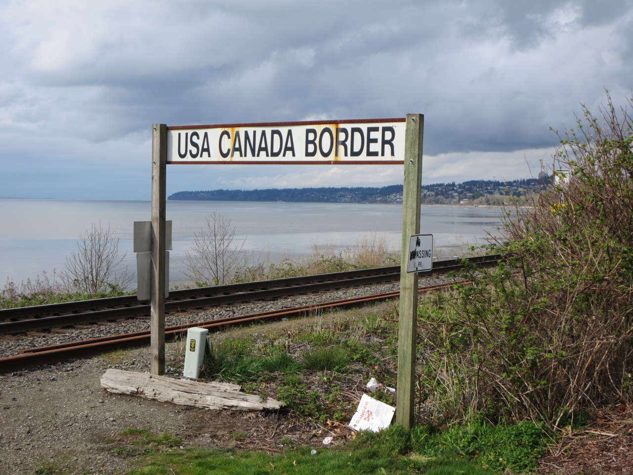 バンクーバーの東側にあるサレーからバスと徒歩で北緯49度に位置するアメリカ~カナダ国境のピースゲート州立公園に行ってみました。日本では絶対見ることのできない陸の国境に興味を持ってのことです。アメリカ側はインターステート5号線という大動脈の道路に大きな白亜のゲートが建てられています。また周辺はよく整備された公園になっていました。この公園は各種催しも開催されるようです。アメリカと大英帝国が広大なカナダの土地を巡って争い、条約が締結されて100年を記念して作られたものだそうです。多くの車が国境を行き交っていました。高さ1mくらいの石柱が点々とあり国境を示していました。ピースゲートには両国が争って、この門が閉鎖されることがないようにという文章も書かれていました、またそばを通るBNSF鉄道の横には国境を示す古びた看板もありました。