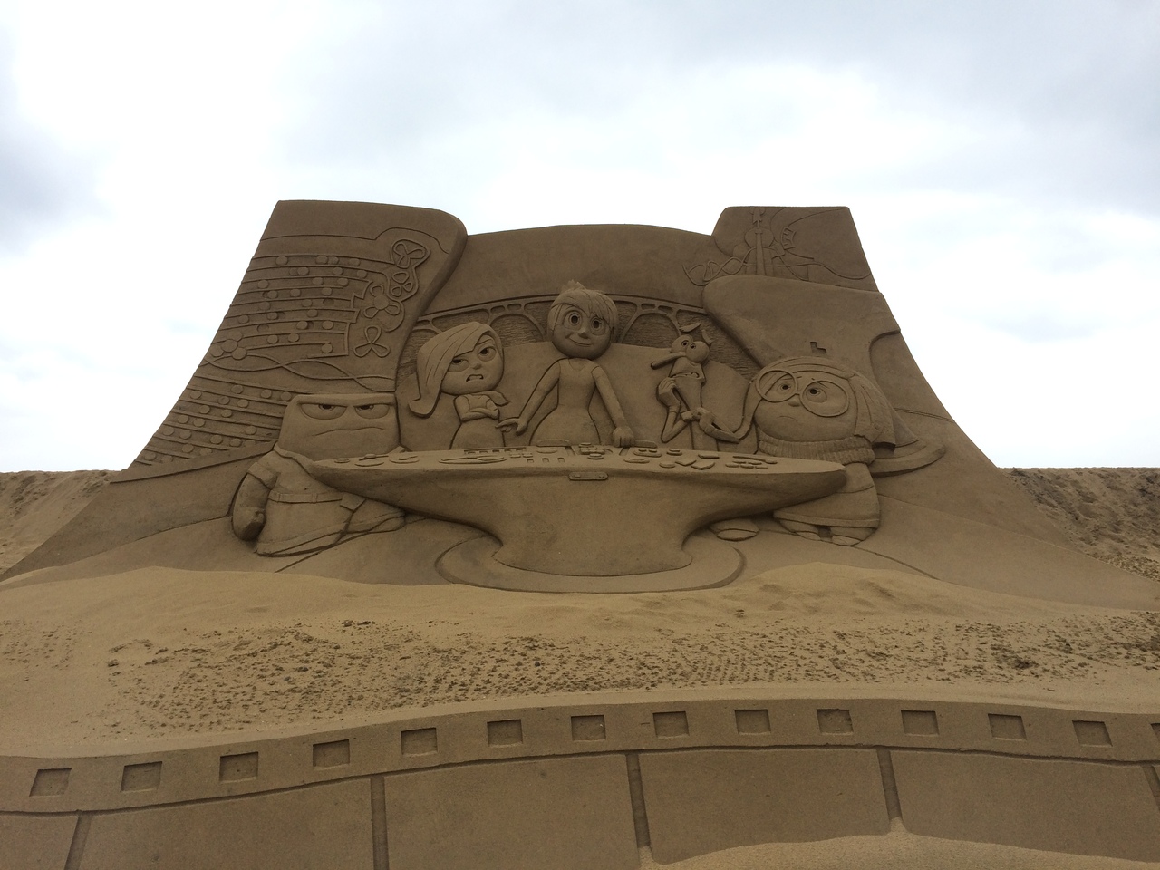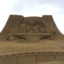 小雨の日に訪れてしまったので、残念ながら太陽は見えず、海も暗かったですが、海の砂を使用したピクサーが圧巻でした。この海水浴場の近くの観光センターでは、給水設備があり、誰でもマイボトルに給水が可能でした。