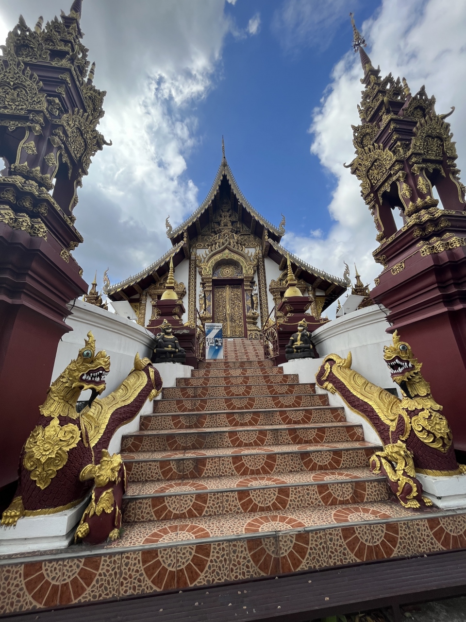 旧市街のお堀の中の北のほうにあるお寺のひとつです。少し離れたところから見ると、大きな仏像があるのがよくわかり、比較的目立つお寺だと思います。同じ並びにお寺が3つほど並んでいるので、装飾の違いなどを見比べてみてもおもしろいかもしれません。