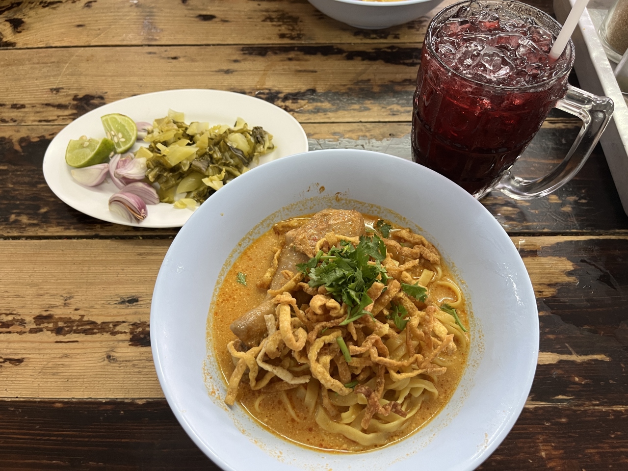 タイ北部でよく食べられているカオソイという麺料理のお店です。オープンエアのお店ですが、とにかくお客さんが多く、にぎわっていました。チェンマイで食べられるカオソイの中でもここのカオソイは特に評判がいいようで、評判どおりおいしいと思いました。