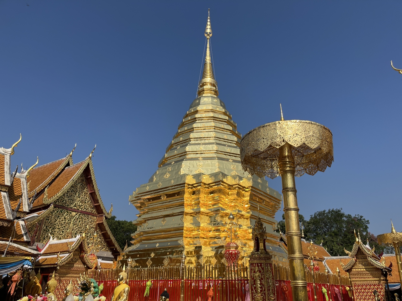 チェンマイのシンボルのような存在のお寺です。旧市街北側のチャーンプアック市場前から、乗客が集まり次第出発するソンテウが出ていますが、時節柄乗客が集まりにくいようで、結局ソンテウをチャーターして行くことになりました。カーブの多い山道なので、車酔いしやすい方は対策が必要かもしれません。ドイステープはチェンマイ市街が見渡せるスポットでもありますが、3月はもやがかかっていることが多いようで、はっきりとは見えませんでした。