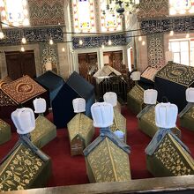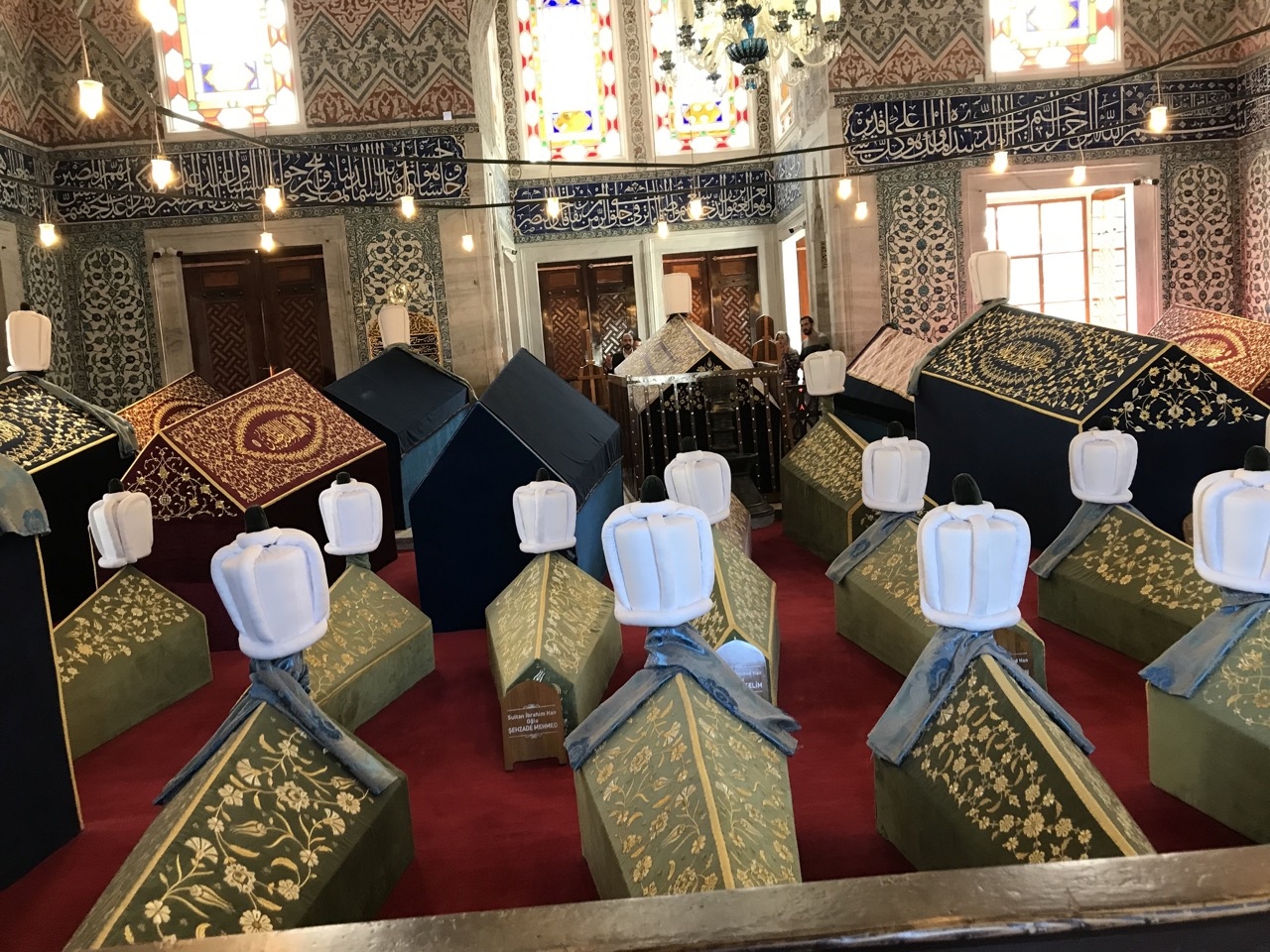 アヤソフィアからスルタンアフメットジャーミィに移動する途中で立ち寄りました。ドイツの泉の近くです。スルタンアフメット1世とその家族のお墓です。たくさんのお棺が建物の中に並んでいます。アヤソフィアにも他のスルタンの廟がありました。
