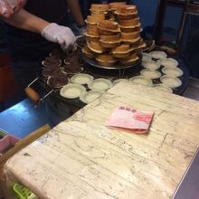 屋台で、焼き立てをタワーのように積んであって、焼き立てかあたたかいままのを紙袋に入れてくれます。夫婦で大好きなお店です。今回も全部で4個、1人2個づつ買って4個とも同じ袋に入れてもらいました。小銭があったほうが便利です
