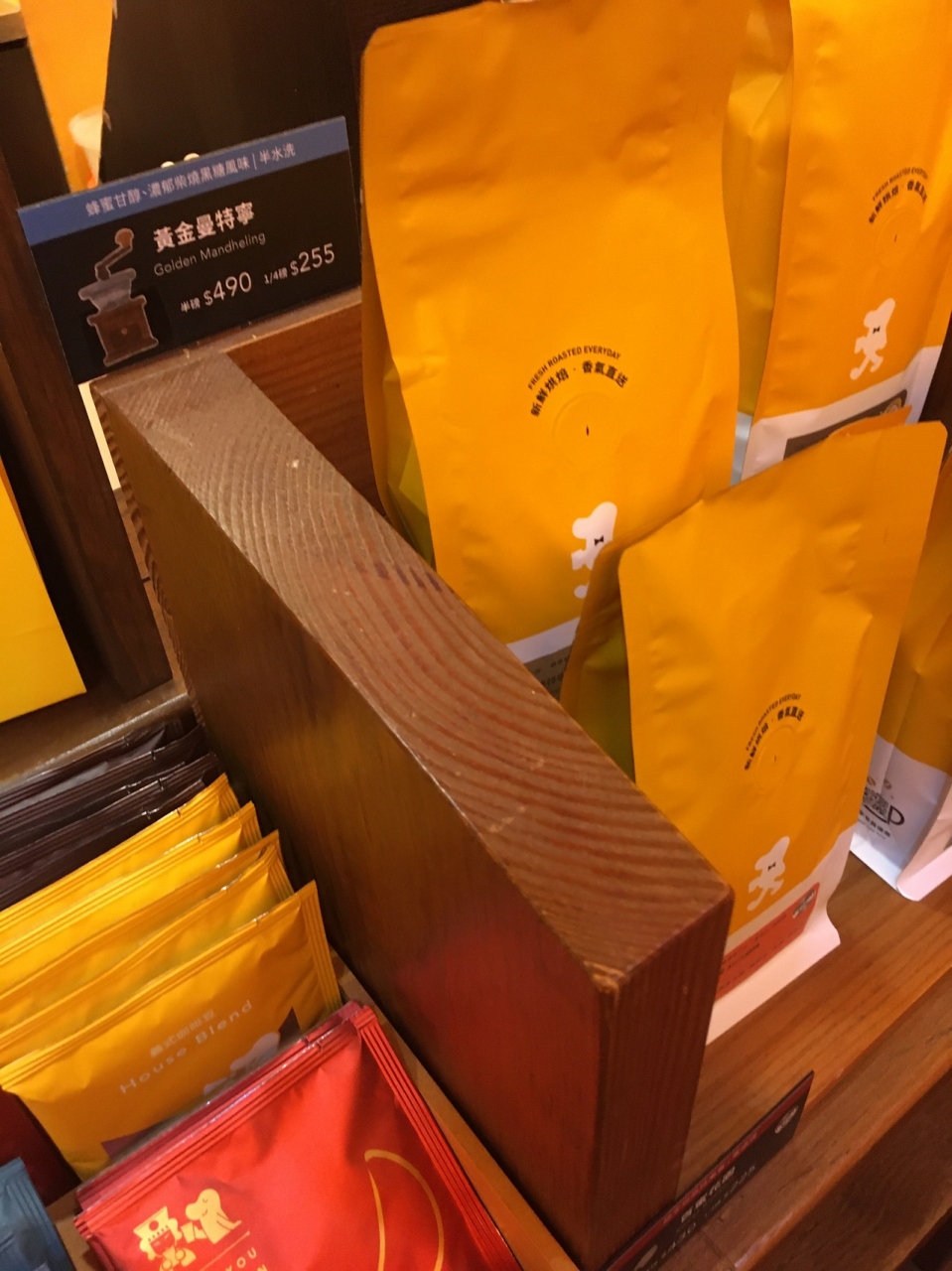 お土産にできるコーヒー豆やコーヒーの粉がたくさんありました。だいたい500元くらいで1袋買うことができました。台湾の豆は扱っていないようで、すべて南アメリカなどの外国産のコーヒー豆でした。店内は、香りがよかったです。
