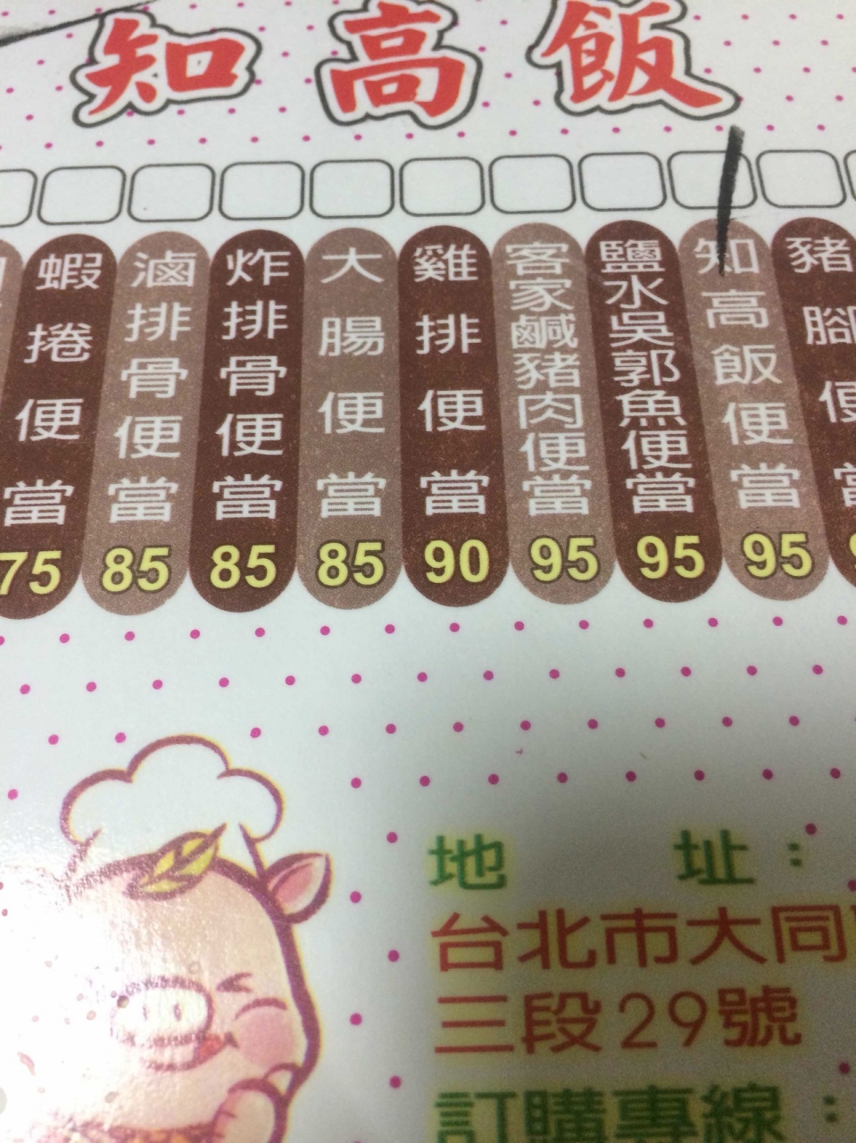 100元以下で1食を食べることができます。お弁当やさん、定食屋さんです。おかずの種類が豊富で、とても良いです。でも、豚の血を固めたものが豆腐と一緒に入っているおかずに気づかなかったので、失敗でした。テイクアウトにしました