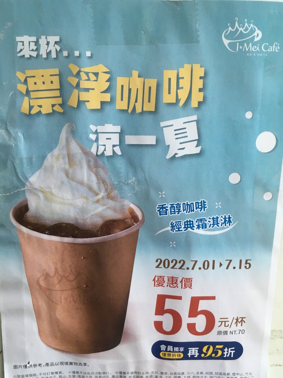 お菓子のチェーン店、メーカーでスーパーやコンビニでも売っていますが、直営店もあります。英語だと、I-Mei という表記になっていますが、中国語の漢字で義美とかいてあって種類が多いです。今回は、新商品のコーヒーフロートに挑戦しました。