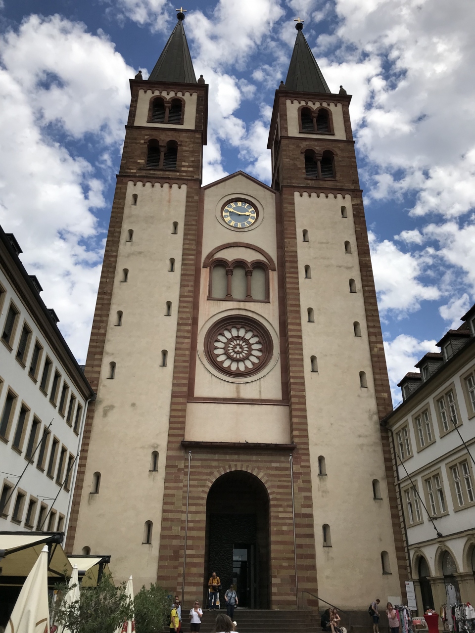 ロマネスク様式の大きな教会で地元ではドームと呼び親しまれているようです。左右の塔が本体と一体化しているとても不思議な形の建物でした。ここからアルテ・マイン橋まで真っ直ぐに道が伸びています。この辺りがヴュルツブルクの一番の繁華街だと思います。教会内部も派手さはないですが、立派なものでした。