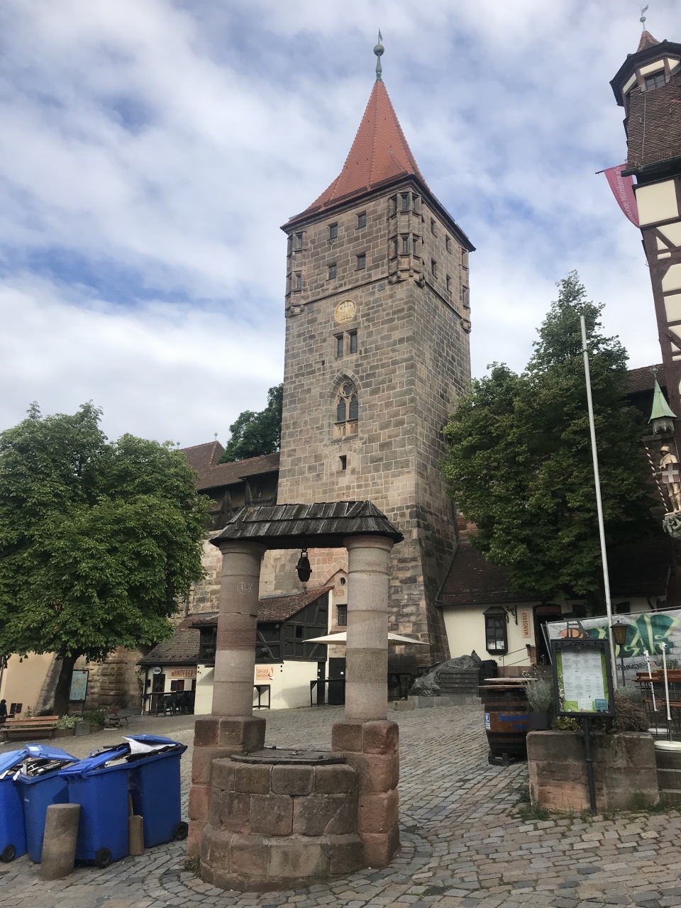 高台にあるニュルンベルク城に登ってニュルンベルクの市街を一望した後に、デューラーの家の方向へ西側に降りて行くと、ちょっと開けた場所に出ました。ティアガートナープラッツやデューラーの家のような木組の家が何軒かあって、眺めの良い場所です。ここからヘンカーシュテークまで散策しましたが、楽しい散歩でした。