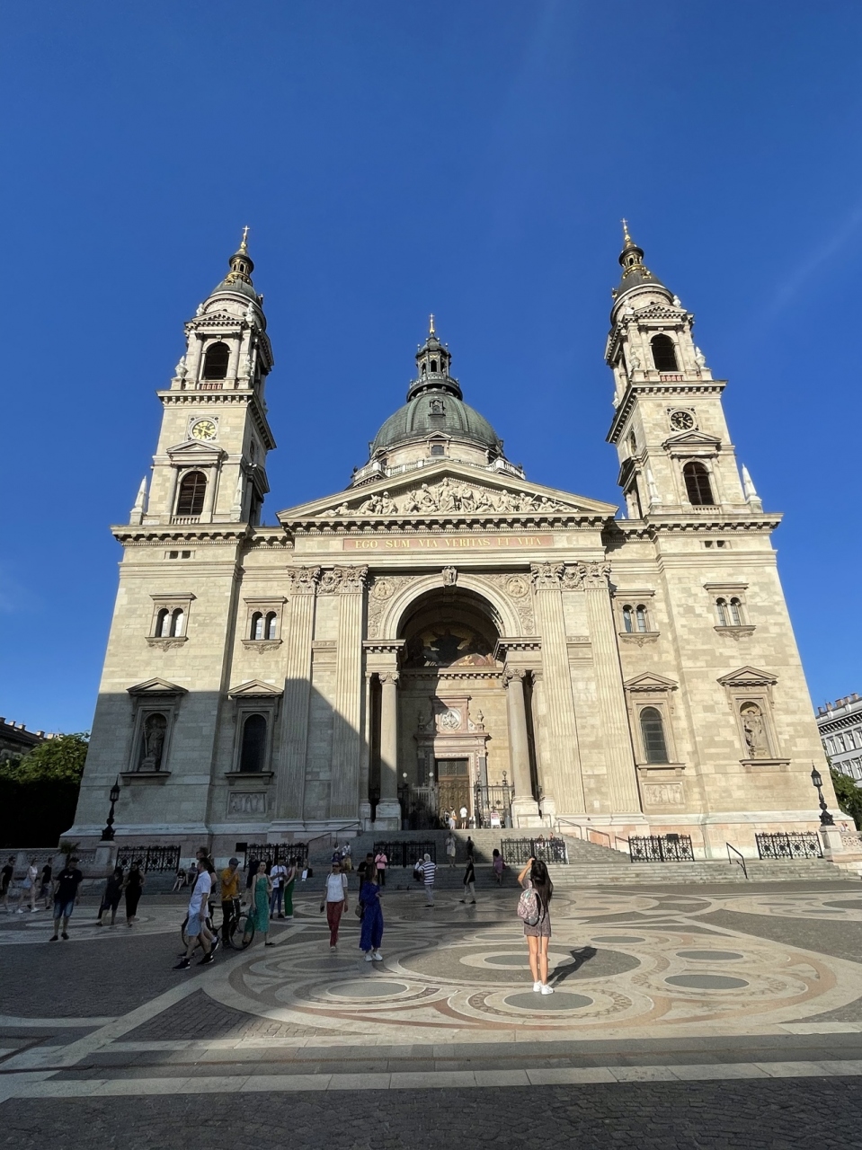 ペスト地域、観光の起点にもなる場所に位置する巨大な大聖堂。正面に伸びた石畳の道から見上げるようにみる大聖堂が絶景すぎる。