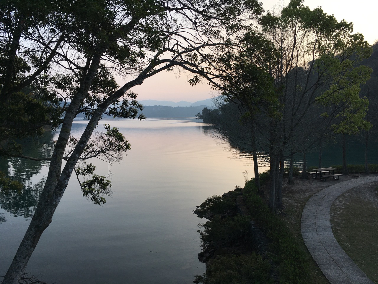 台北から日帰りで客運バスに乗ってくることもできます。でも、やっぱり近くのホテルか民宿に1泊して、夜景も朝の日の出も楽しんだ方が良いです。湖の面は、すごく静かで鳥も静かに飛び立っていました。湖の周りの景色も色々変わりました。