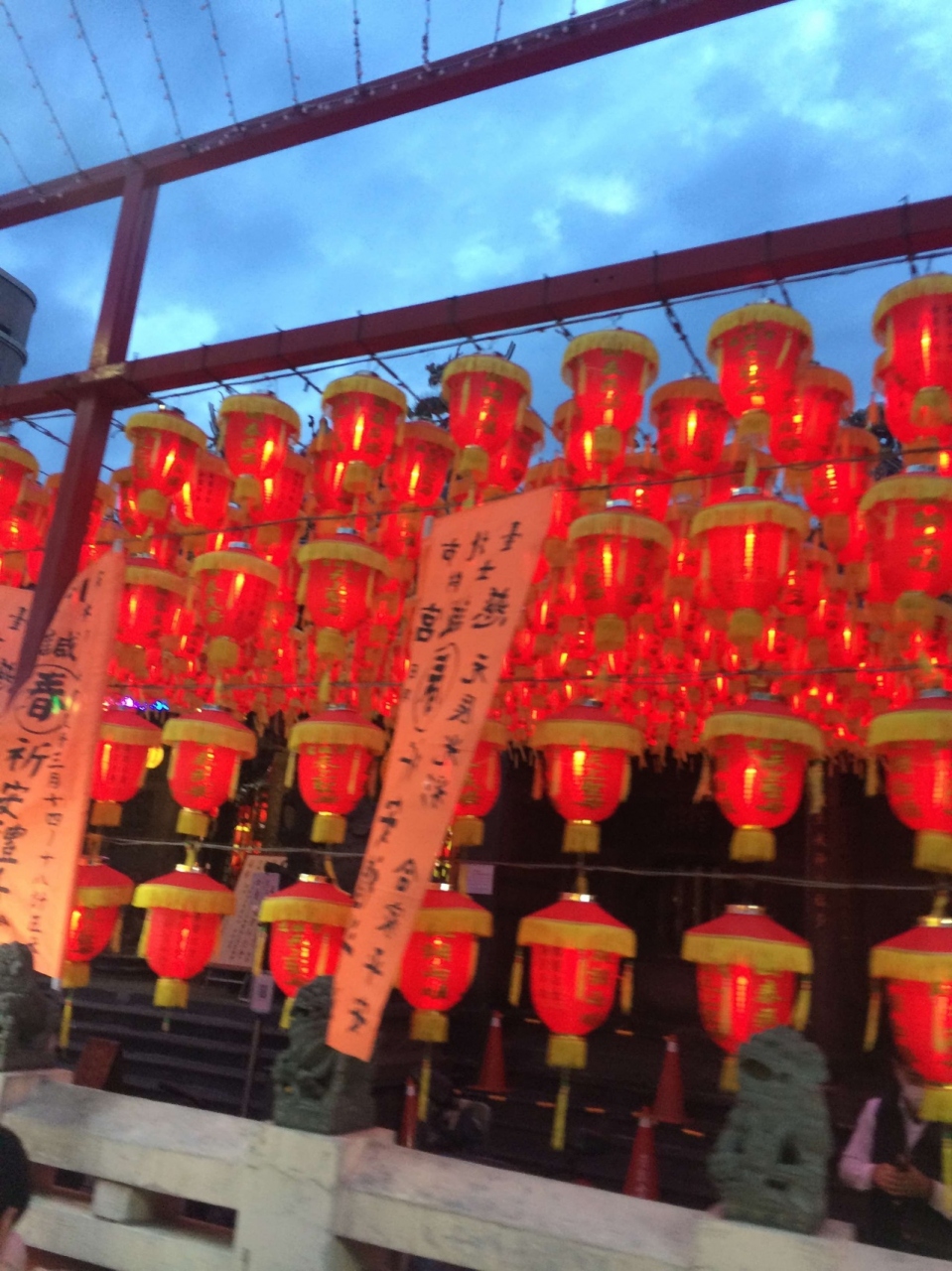 台湾では、お寺のあるところには大体夜市があります。お寺が先で、お寺の前の道路に夜市ができるようです。赤い提灯が数多く飾られていて、夜になると少しだけ九分のような雰囲気がありました。イカの焼いたにおいが漂ってました