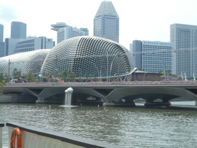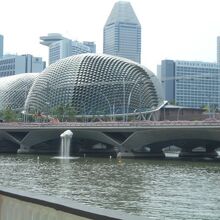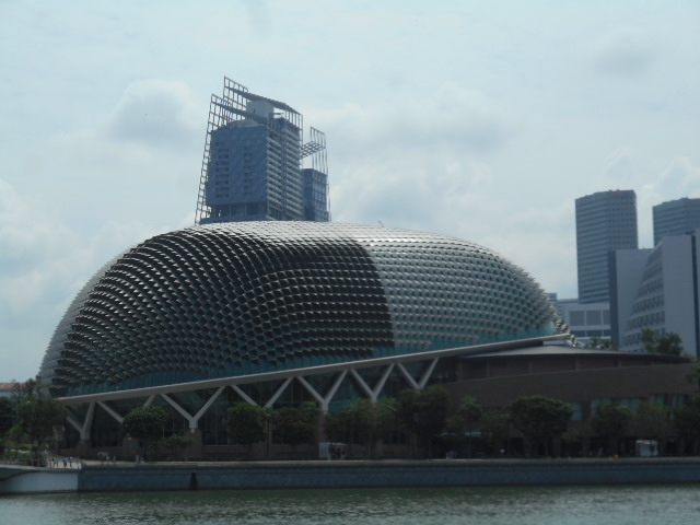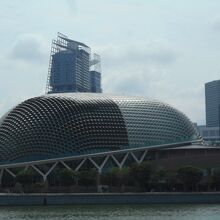 マリーナ湾に面して建つ、エスプラネード・シアターは劇場や音楽ホールの施設、レストラン、ショツピングモールになっています。外観はぼつぼつした果物のドリアンを半分に割ったような形で、シンガポーリアンは別名、ドリアンドームと呼んでいます。