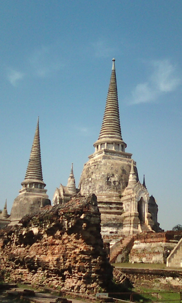タイ国でも`アユタヤの遺跡`はツアーで行きました;2005.5/2013.12。`菩提樹に包まれた仏頭=仏さま`です;日本人ツアーの皆さんは自然に合掌して、写真(下方から)を撮りました☆ 大きなお寺群/多様な塔//の「遺跡」は何とも言えないです,,