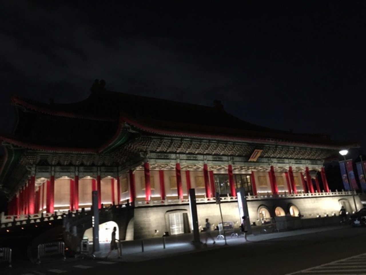 台湾のコンサート用のホールで2つとも左右対称に建っています。中正紀念堂駅からすぐのところにありました。夜になって下からライトアップされると、彫刻が際立って、暗闇に赤い建物が浮かぶので、ぜひ夜の姿も見て欲しいです。