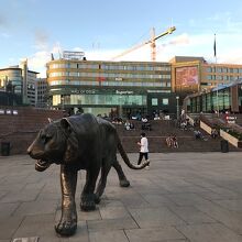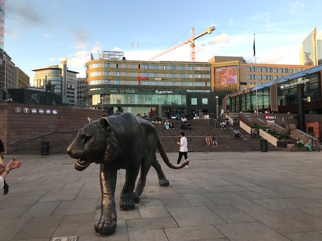 オスロ中央駅前にある広場です。オペラハウス側の出口ではなくて、旧オスロ駅舎側の出口の前に広がる広場です。ここからカール ヨハンスガーテ通りがノルウェー王宮まで続いています。広場には虎の像が設置されていて、観光客が写真を撮っています。