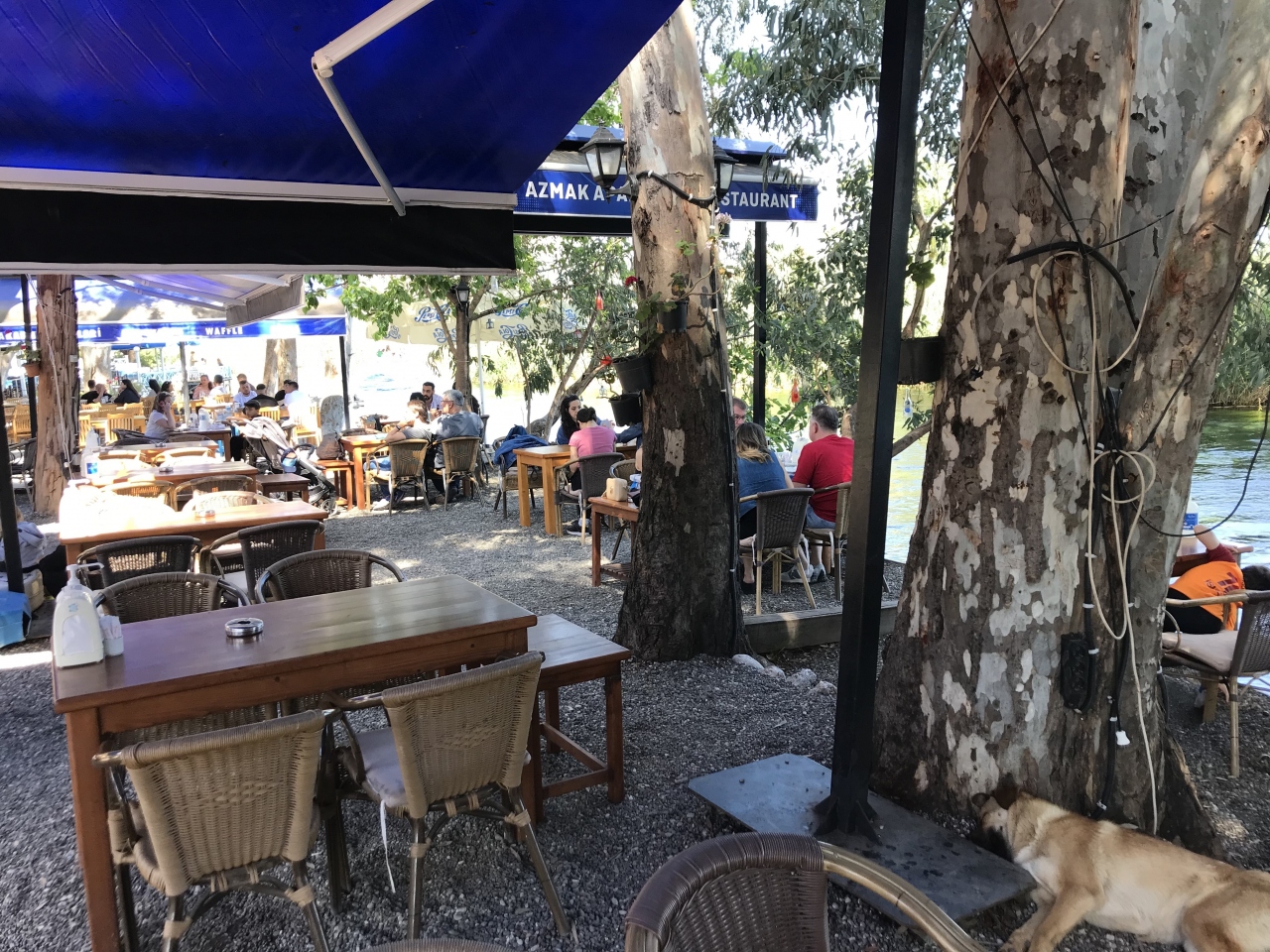 トルコのエーゲ海にあるチッタスロー登録のリゾート村のアクヤカに行った時にお茶をしたカフェです。有名なアズマック川沿いにあって、川を眺めながら食事をしたりお茶を飲んだりできます。オープンテラス形式で、川沿いに机と椅子を並べただけですが。トルコ茶1杯で10リラと普通の倍の値段でしたが、場所代として仕方がないでしょう。