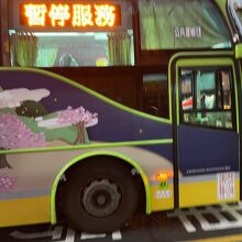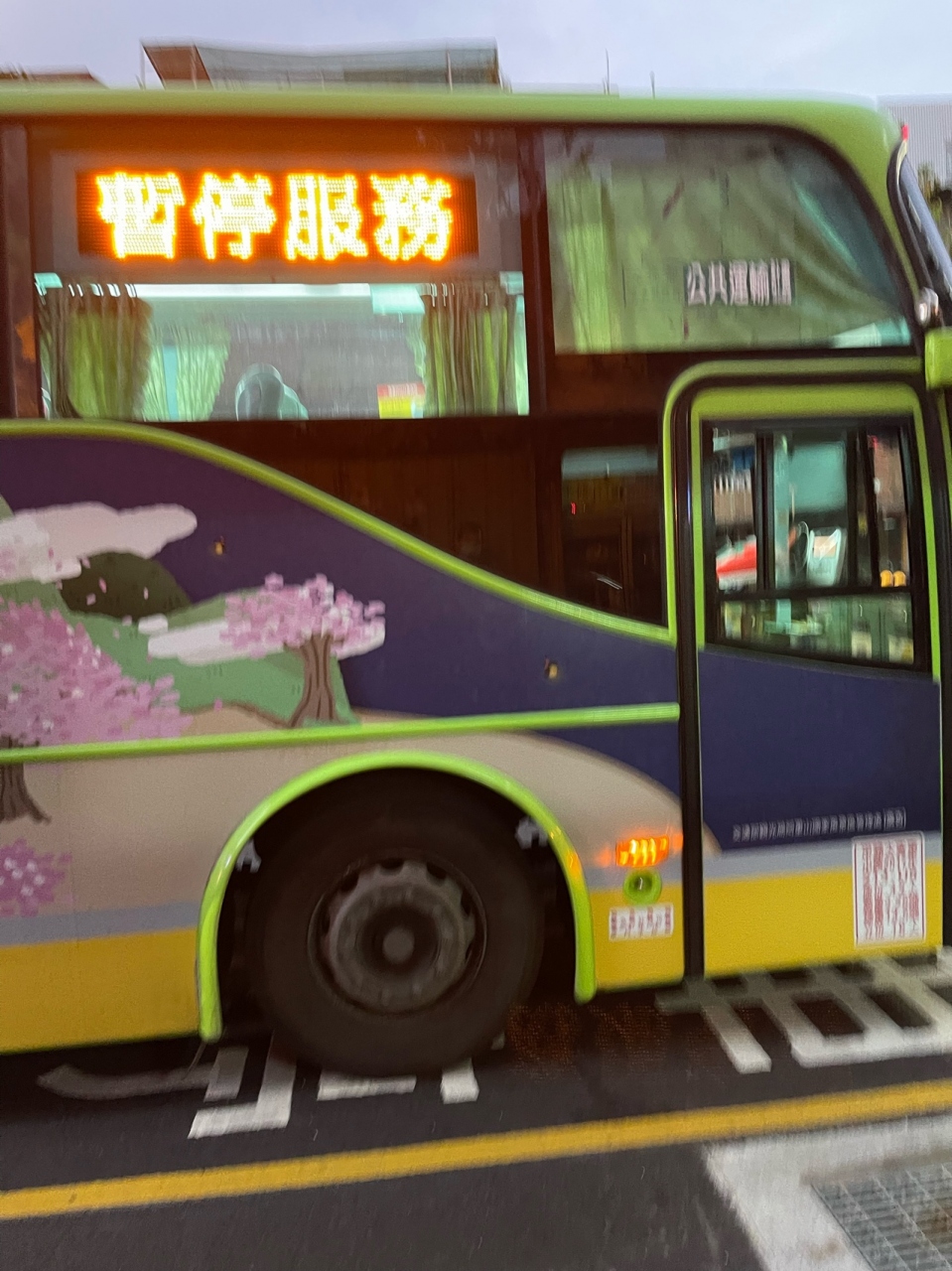 くまもんに似ていますが、台湾の山にいる台湾特有の種類のクマのキャラクターが描かれているバスが走っていました。珍しくて、乗れて良かったです。私たち夫婦がおりた後は、回送マークがついて、もう運転終了のようでした。
