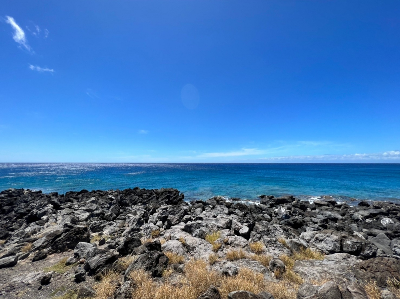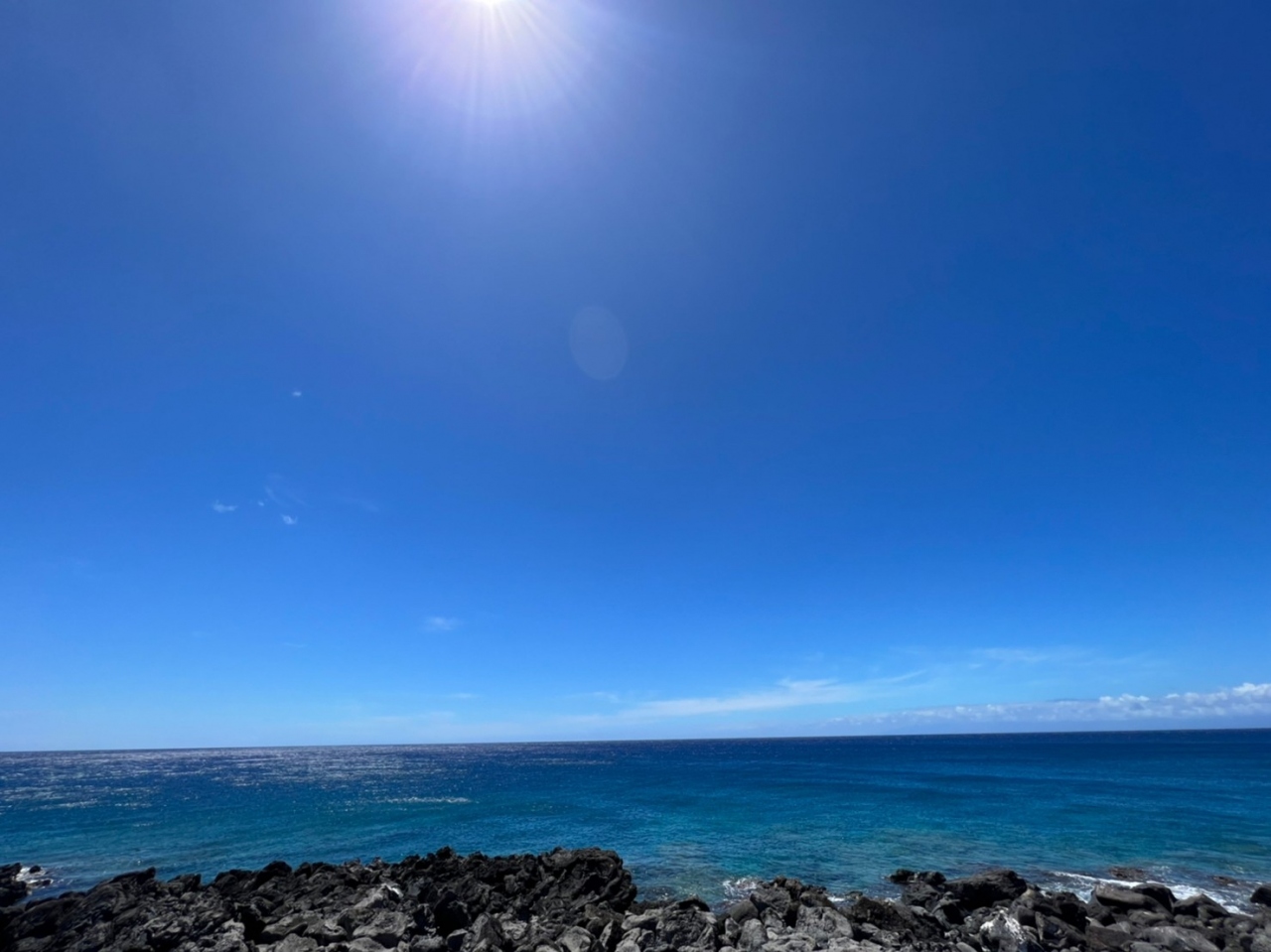 海岸線から見える透き通った海水の太平洋、そして遠くにマウイ島のハレアカラ山も見え