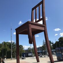 ジュネーブ市街からバスに乗って行きました。大きな噴水のある広場があり、その先に赤い有名ばこの壊れた椅子がありました。想像していた以上に大きなオブジェクトで驚きました。高さは12メートルもあるそうです。1本の脚が壊れていて、地雷の恐ろしさを表現したそうで、インパクトがありました。