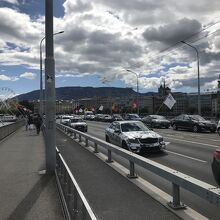 コナルヴァン駅からモンブラン通りレマン湖の湖畔に出て、このモンブラン橋を経由して花時計があるイギリス公園に行くというのがジュネーブの王道のコースだと思います。なので人通りは多いです。このモンブラン橋からは有名な大噴水が綺麗に見えます。