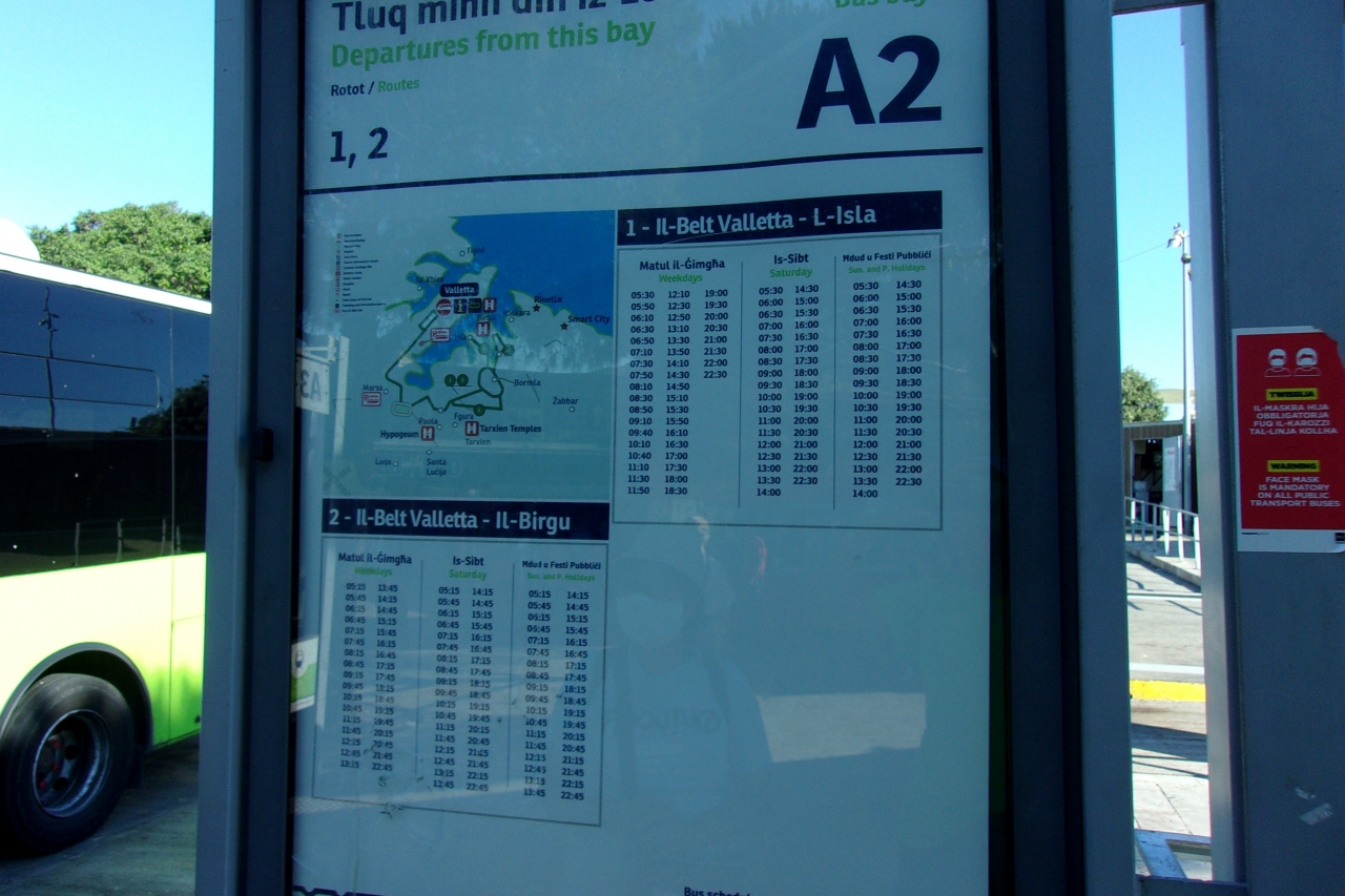 その、Malta Public Transport の一番のターミナル、ヴァレッタのメインバスターミナルは。規模は大きいですが、A、B、Cの三つのゾーンに分けられ、ゾーン内はさらにA1,A2と区分けされているので、乗り場を見つけ易かったです。