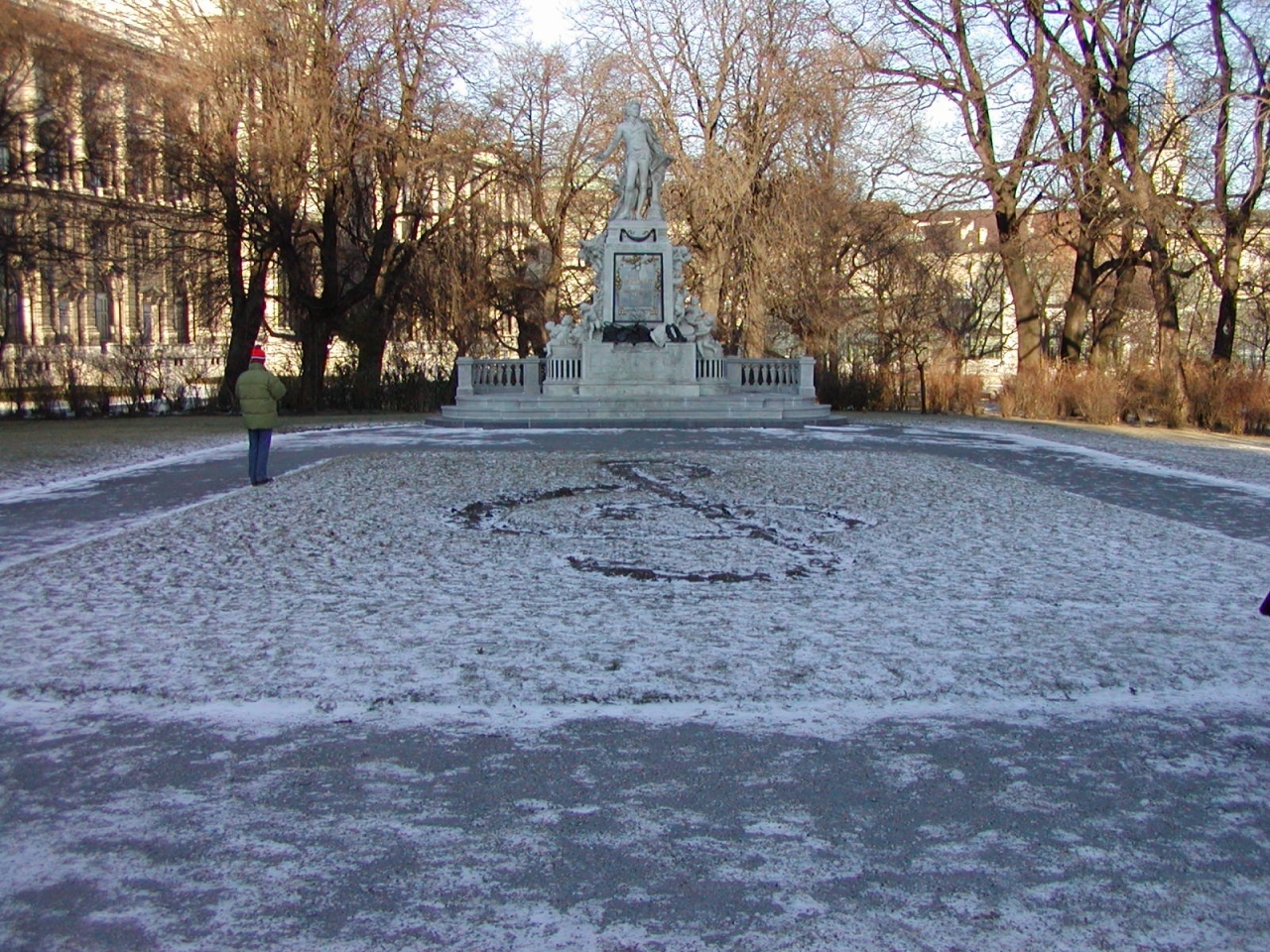 王宮を取り囲む庭園で、ナポレオンがウィーンに入城で破壊された要塞跡地に造られた所にモーツアルト像がト音記号の形の花壇が在るのですが、私達が訪れた時は1月で花は無く、雪が積もっていました。王宮庭園のリンク側の入り口付近に在るのでわかり易かったです。