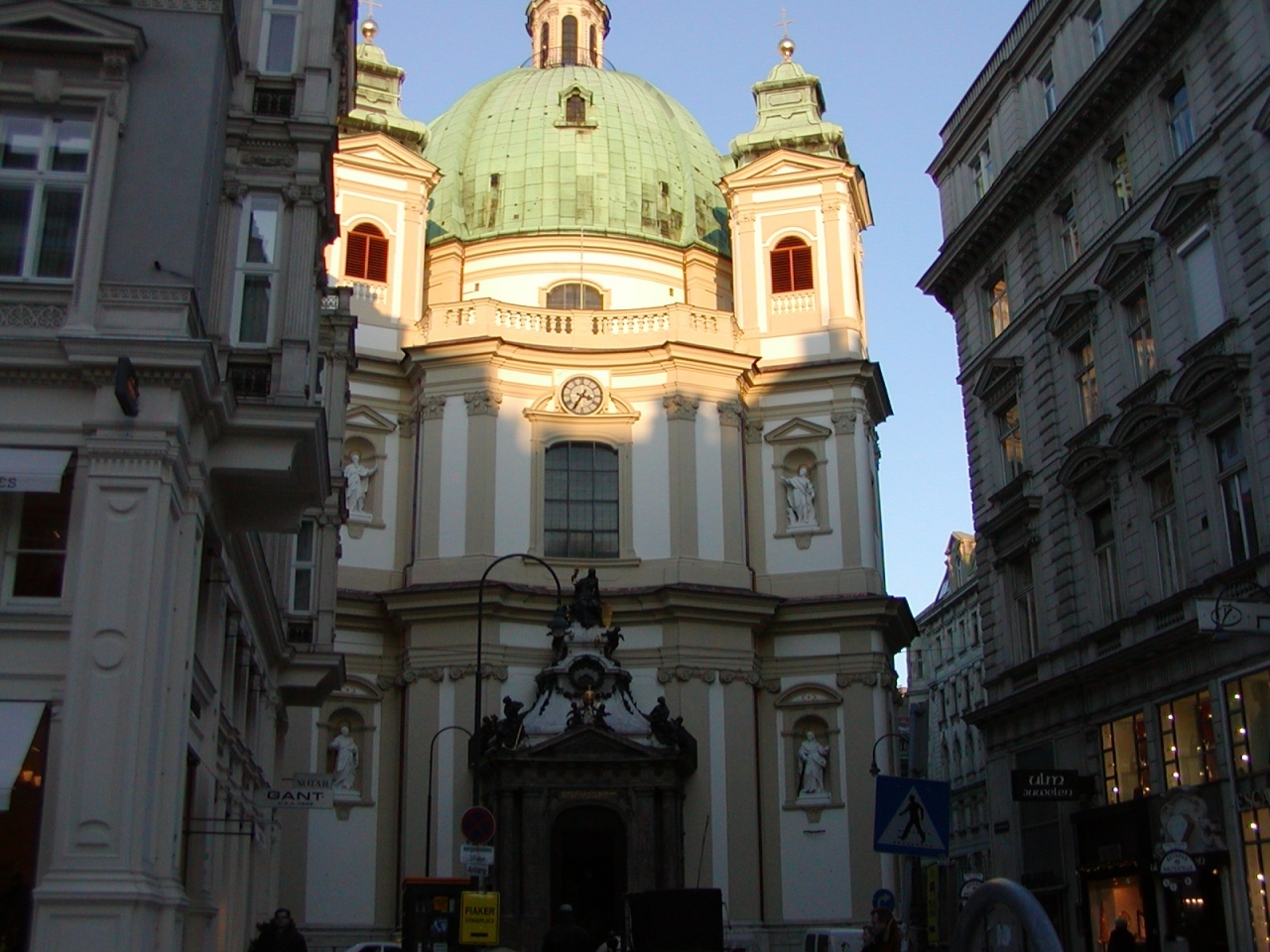 ウイーンの古い教会で、9世紀初頭にカール大帝が創設したそうですが、シュテファン寺院の近くにあり、クラーベンの繁華街のベスト記念柱からも徒歩数分で行ける”ペーター教会”がドームの天井の”聖母マリアの被昇天”が有名で、だまし絵の効果で天井が高く見えるようにしたそうです。