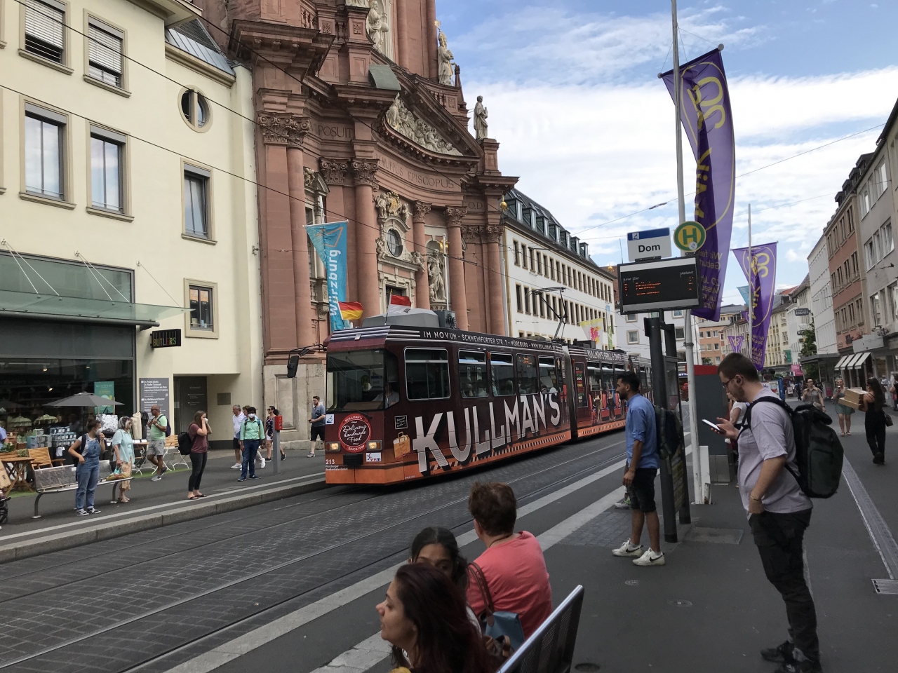 世界遺産に登録されているレジデンツがあるヴュルツブルク中央駅で電車を降りて外に出るとトラムとバスの乗り場があります。このトラムはヴュルツブルクの見どころのザンクト キリアン大聖堂などがある旧市街に行くことが出来ます。複数の路線があるので、他の場所にも行けます。バスよりも便利だと思います。ヴュルツブルクの観光にこのトラムを何度も使いました。