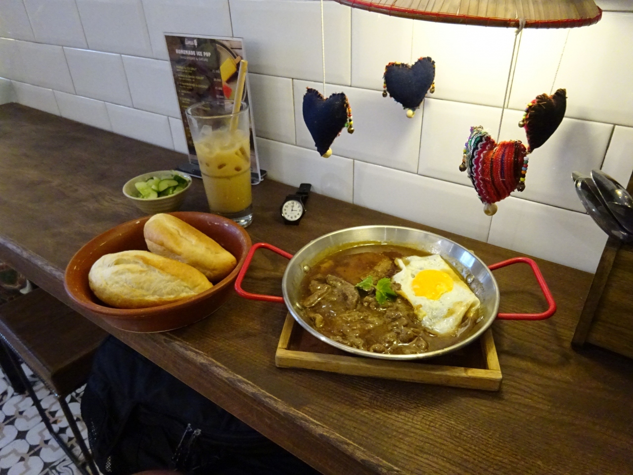 両替をしたばかりで,懐が温かかったのでちょっと高めのメニューを注文したところ,パンと肉を煮た鍋が別々で出てきました。…自分で作る楽しみ?