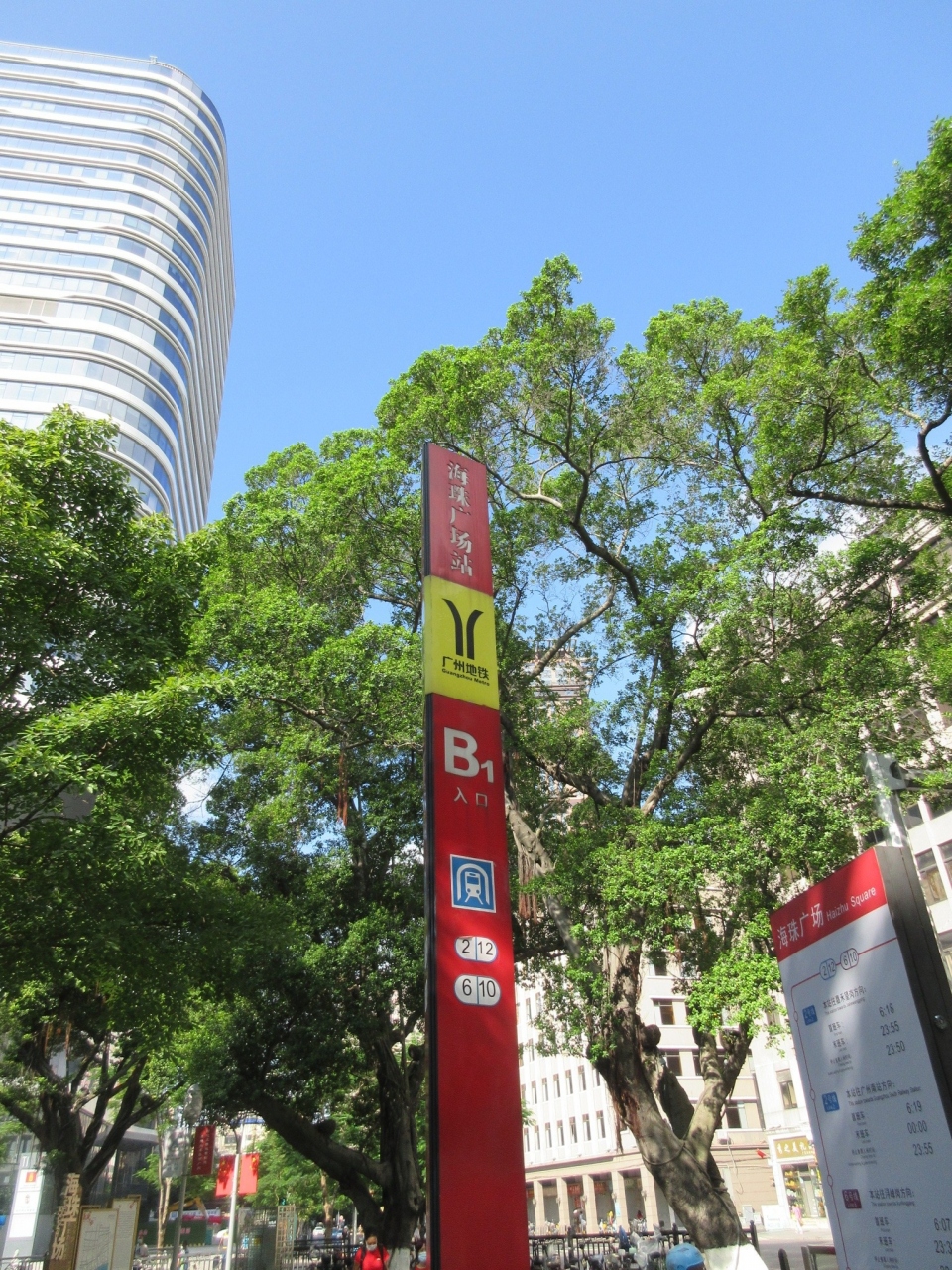 沙面へのアクセスが6号線、鎮海楼が2号線であり、この2路線の乗り換え駅となっていて、大勢の利用客でいつも混雑しています。ちなみに、この日は【石室聖心大教堂】を訪問する際に利用しました。大教堂へ向かう場合には、駅を出てすぐ目の前に見える「広州解放記念像」という共産党の国らしい石像と逆の方向、つまり一徳路を西に向かいます。