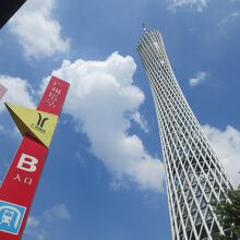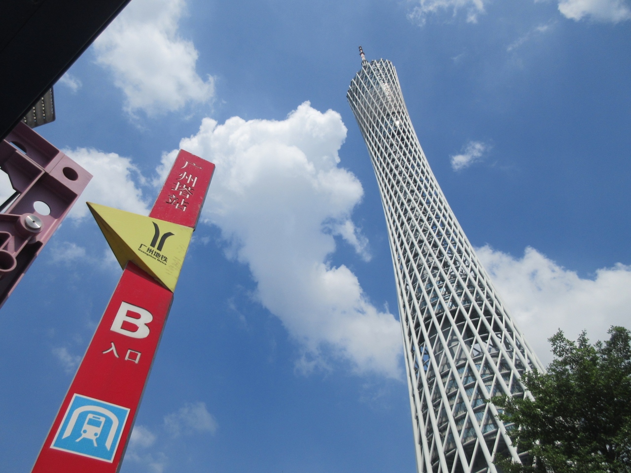 広州塔へ行く際に利用した、地下鉄3号線の駅がこちらです。地下鉄の改札を出て地上に出ると、目のまえに高さ600mの広州塔がそびえていました。あまりにも近すぎて見上げると全体のフォルムがわかりにくいですね。午後の訪問であったので、浜江東路を西に進み全体像を楽しめるスポットを探したくらいです。ただ、珠江の対岸にある高層ビル群を眺めるには最高のロケーションでした。
