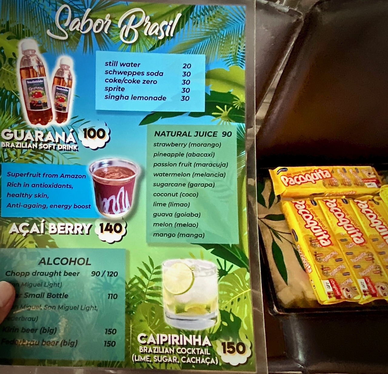 食事はというと、メニューは、豊富。カイピリーニャもあれば、ブラジル人のソールフード:フェイジョアーダ(豆ご飯)、パウテウ(ル)、コッシーニャ等々なんかもあります...な...懐かしい...