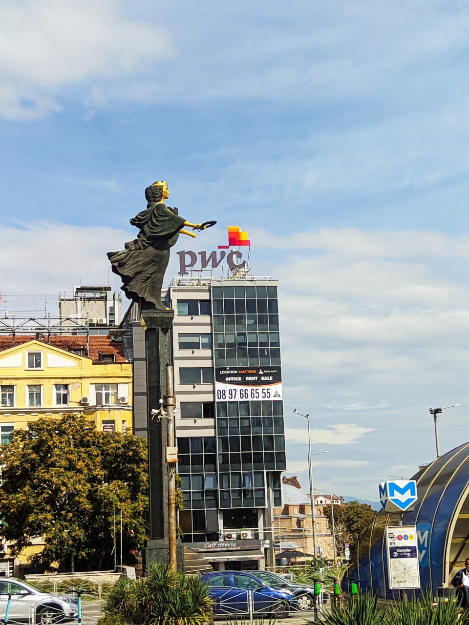 像の正面は交通量の多い広い道路に面しているので、側面から写真を撮りました。隣のビルのソフィアの企業経営コンサルタント会社”PWC”の文字が丁度良い位置?にあり、像の背景のようになっています。