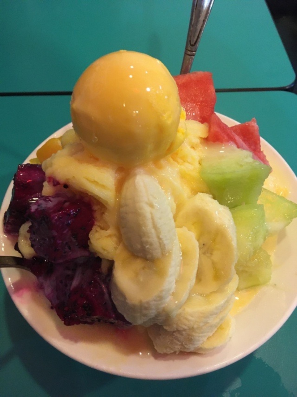 思ったよりもフルーツ盛りだくさんで出てきたので、かなりテンションが上がってしまいました。スプーンも思慕惜は、プラスチックのスプーンなのに対して、こちらはちゃんとステンレスだったので、冷たいのが伝わってきて最高でした。
