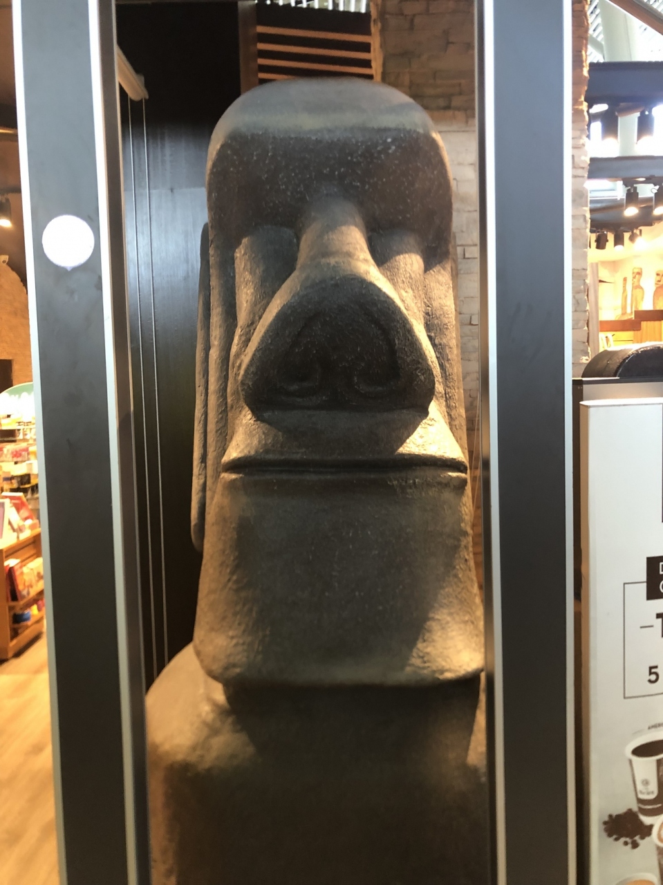 空港内のお土産店前には定番のモヤイのモニュメント有り。