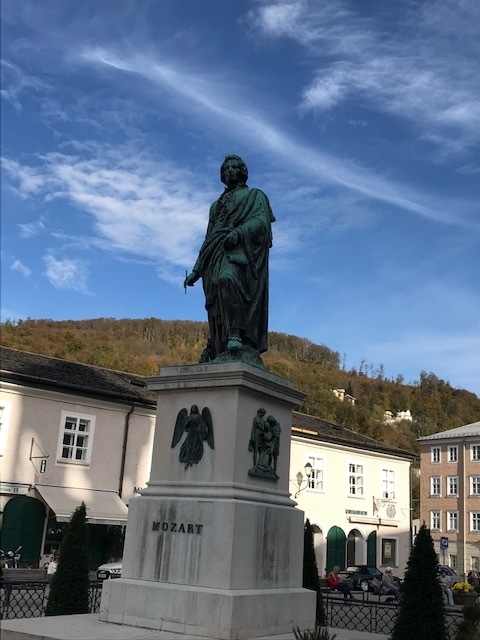 ザルツブルクはモーツァルトの故郷だけあって、あちこちにモーツァルト由来のものがありますが、モーツァルト広場にあるこのモーツァルト像が一番目立つと思います。旧市街の観光の中心部のレジデンツのそばにありました。