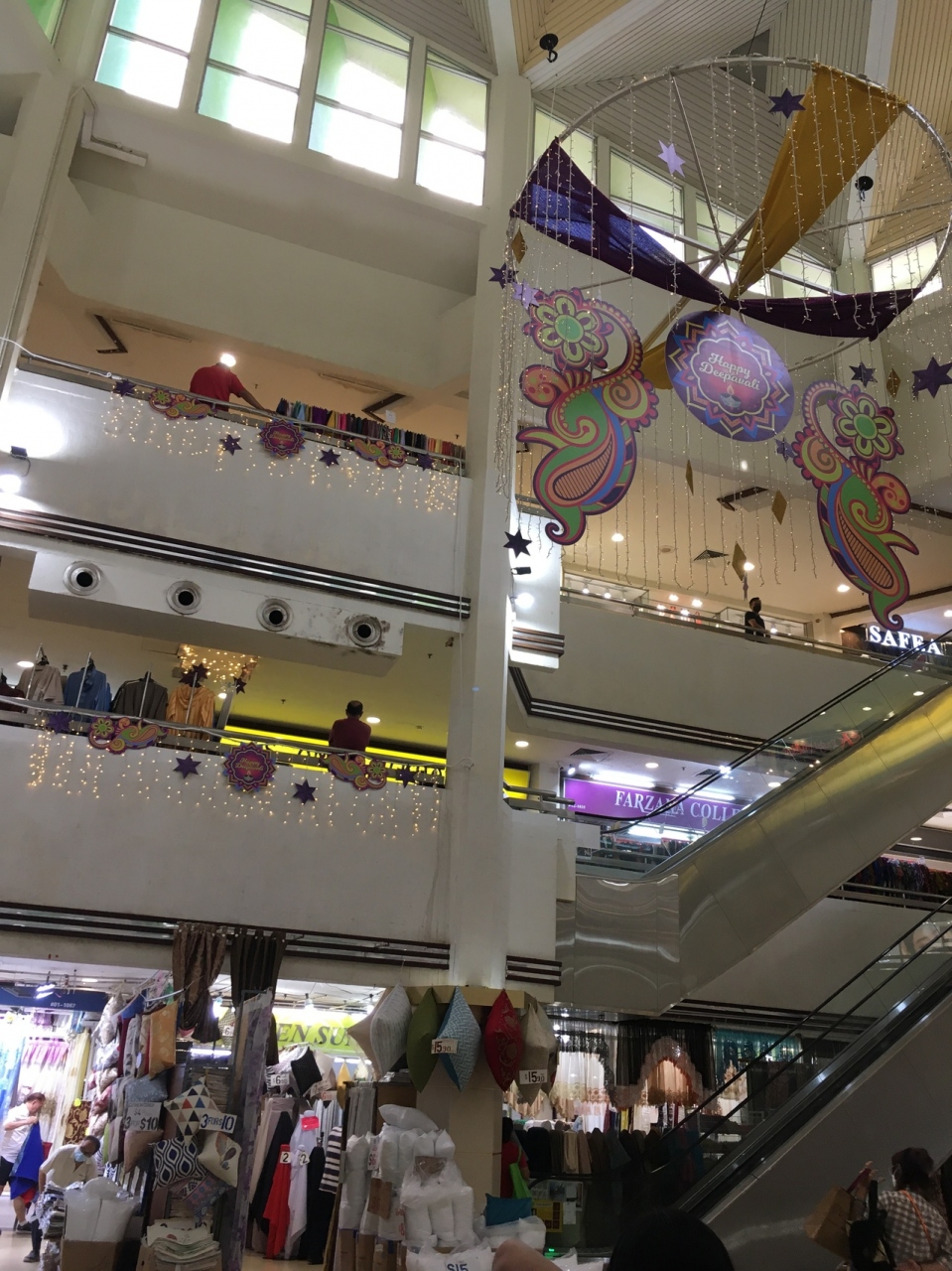 パヤレバー駅から10分ほどの場所にあるマレー系の商品が置いてあるショッピングセンターでゲイランセライマーケットと渡り廊下でつながっていました。ショッピングモールの吹き抜けには謎の飾りがありマレーシアのランカウイ島で入ってショッピングモールと雰囲気が瓜二つでした。