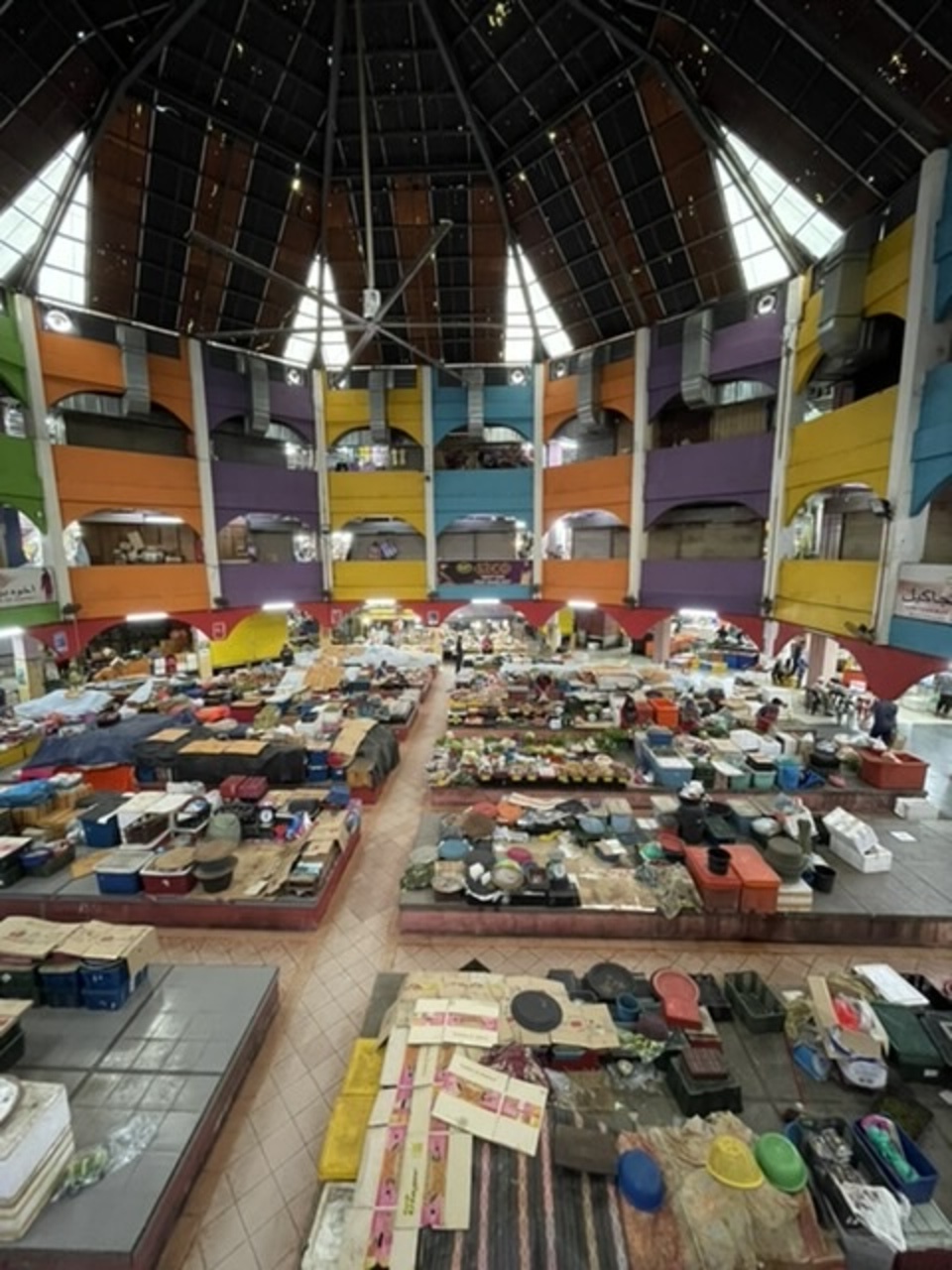 中心が吹き抜けになっている建物内でマーケットです。1階は生鮮食品 それぞれの区画で魚、肉、野菜、乾物類、穀物、加工食品などあやるゆ商品が売られています