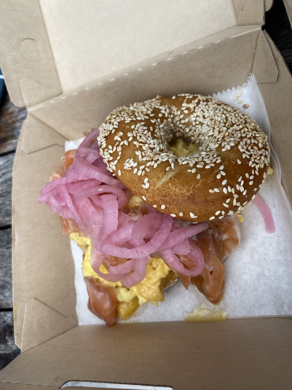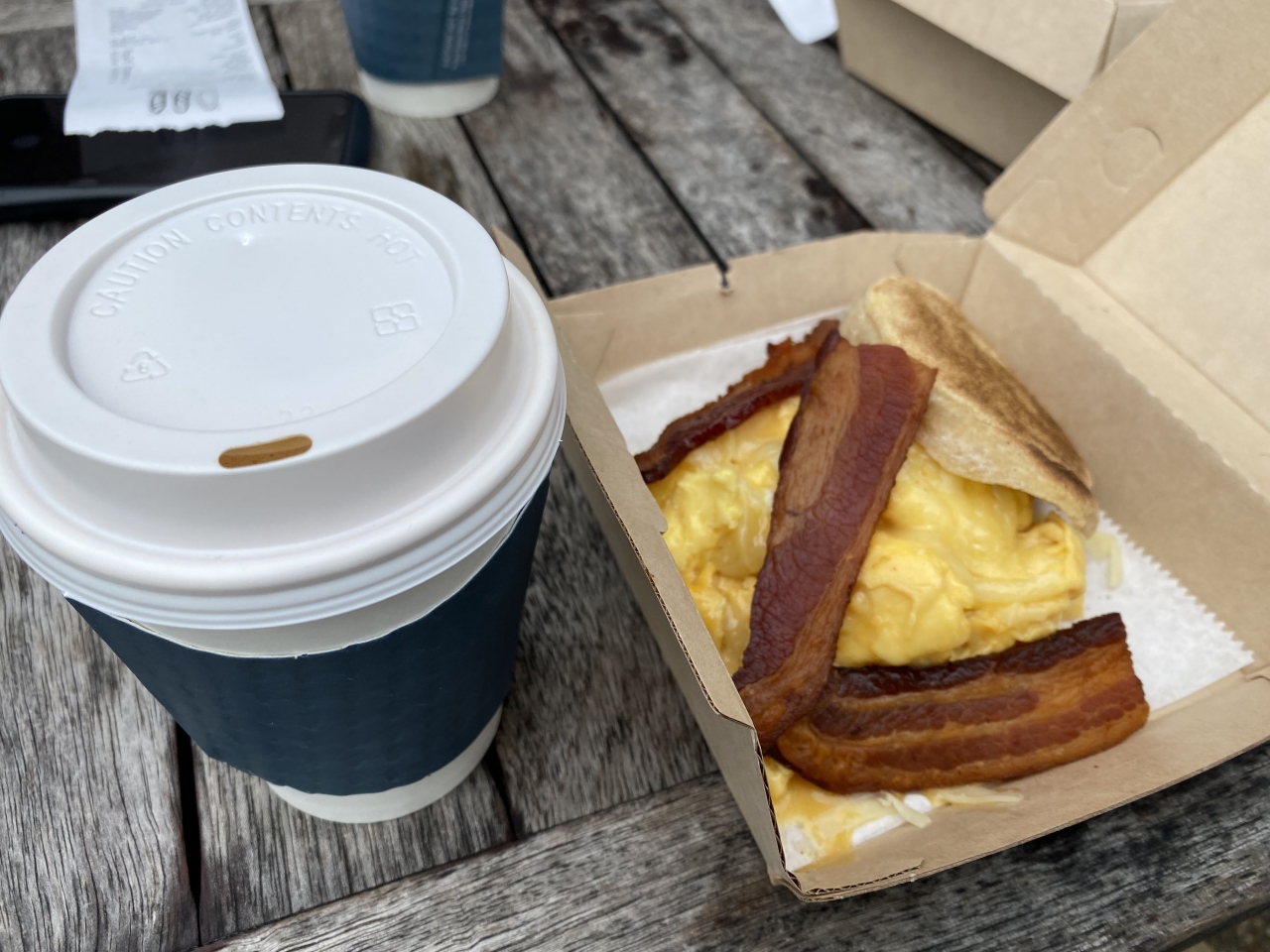 コネチカット・アヴェニューにあるベーカリーショップです。泊まったホテルのすぐ近くでしたので朝食で利用しました。パンやセイボリーフードなど多様な品揃えのベーカリー・ショップ。お客さんがひっきりなしに出入りする人気の店です。私はカフェラテにベーコン&チーズ入りメッシーエッグ(サワードゥブレッドにスクランブルエッグを乗せたもの)…これで$13.1です。妻はキャラメルラテにL.E.Oベーグル(ノバ・ロックス=カナダのノバスコシア地方産の燻製サーモンと卵・赤玉ねぎのピクルスを乗せたベーグル)…これで$18.2です。合計しめて$31.3…美味かったんですけど、パン屋の朝めしで2人で4千円越えです(泣)。