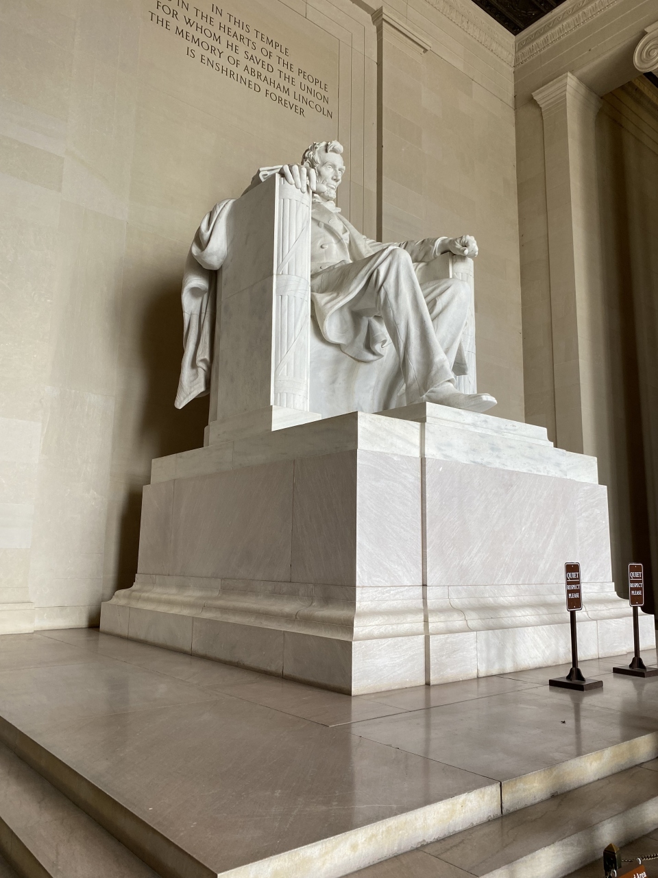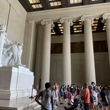 D.C.で最も人気のある観光スポットと言っても過言ではないでしょう。真ん中の奥に、”奴隷解放の父”とされアメリカでもっとも偉大な大統領との呼び声高い、第16代アメリカ合衆国大統領「エイブラハム・リンカーン」の像。さすがにここは観光客が多めでした。1922年に第29代のハーディング大統領によって除幕式が行われました。1865年に暗殺され、1867年に議会でリンカーン記念碑協会が設立されてから55年後のことです。ゲティスバーグ演説(「人民の人民による…」)が有名ですが、隠れた名言の「未来を予測する最良の方法は、未来を創ることだ」に、彼のスケールの大きさを感じるとともに、これから多く訪れるであろうアメリカ南部のエピソードを通じて、彼の偉大さを感じることになりそうです。リンカーン記念堂リフレクティングプールに写るワシントン記念塔。ここは、1963年にマーティン・ルーサー・キング・ジュニアがワシントン大行進後に演説を行った場所でもあります。
