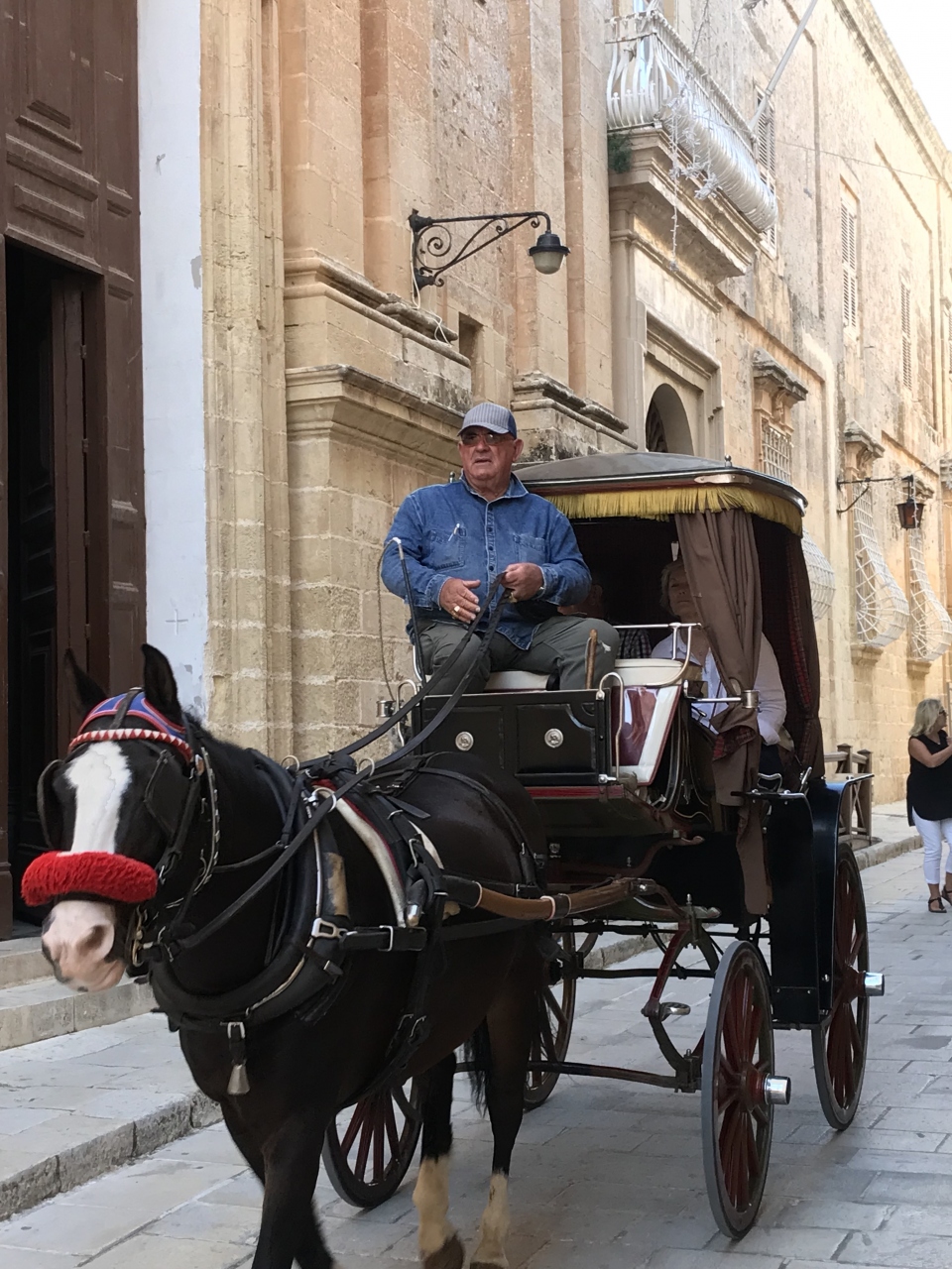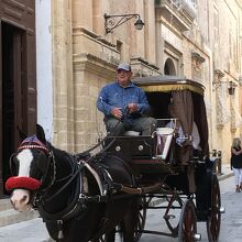 バレッタからバスで静寂の街エムディーナへ行きました。バスを降りると近くにエムディーナ城塞への入口のメインゲートがあります。そこから見どころの聖パウr教会、その奥の見晴台まで、このVillegaignon Street を進んでいきます。狭い路地をたまに観光馬車が通ります。
