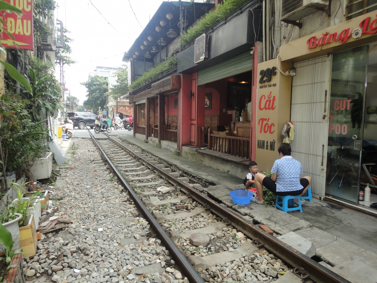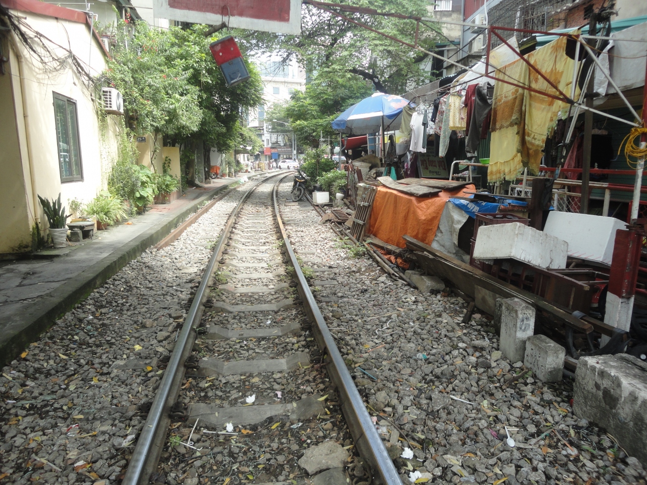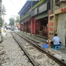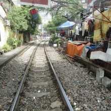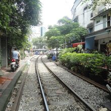 ハノイ駅の北側の線路を歩いてみました。線路は単線で、お店や住居がぎりぎりに建てられていました。線路沿いに細い道が1本ありましたが、そこはバイクの抜け道になっているようで、ひっきりなしにバイクが走ってくるため、仕方なく線路を歩く羽目になりました。列車の本数は少ないようで、列車が通り過ぎる風景は見られませんでした。