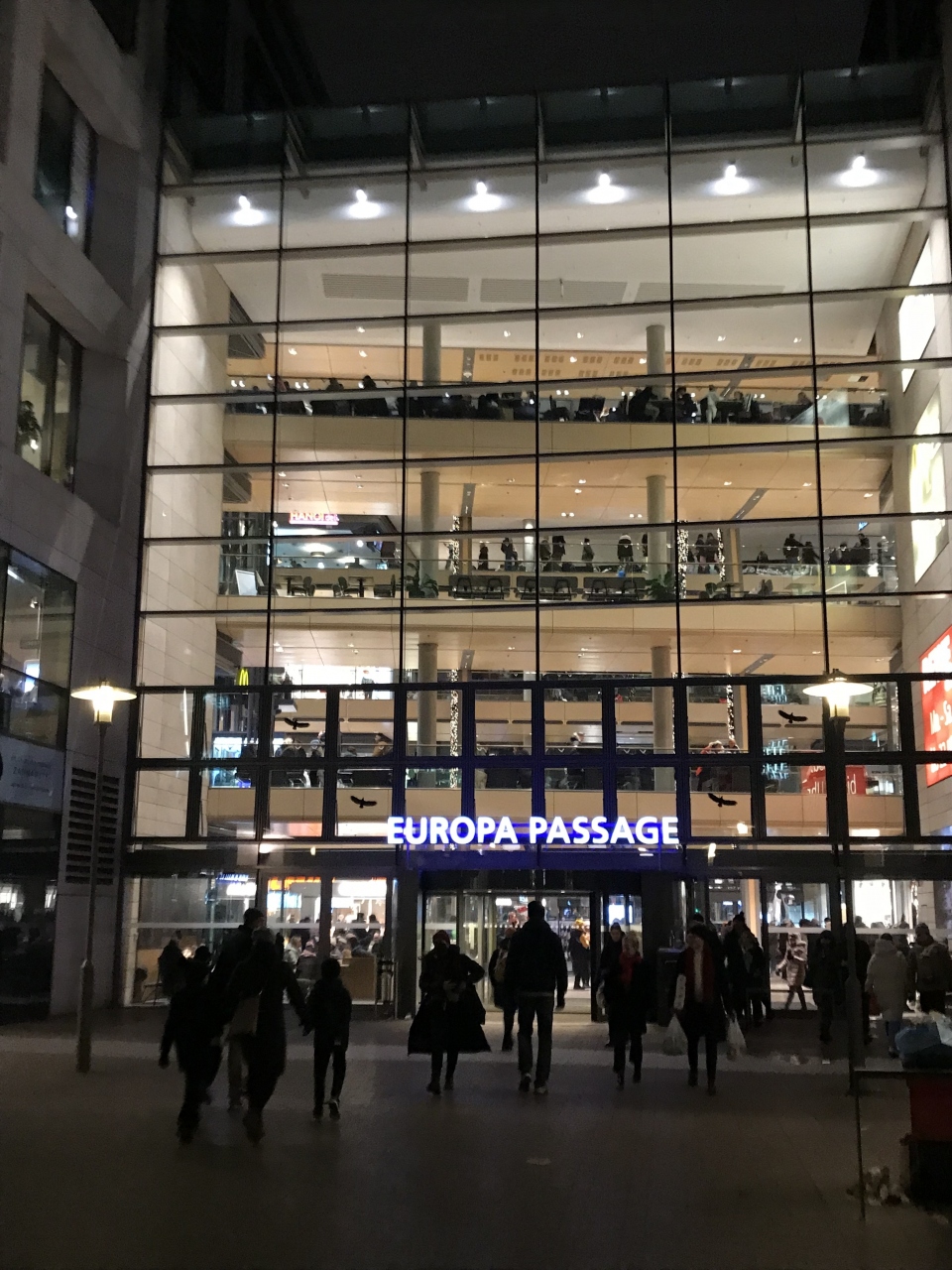 クリスマスマーケットで賑わうハンブルグの市庁舎広場のすぐそばにあったショッピングモールです。クリスマスの飾り付けがされていてとても綺麗でした。夜のクリスマスマーケットを見に行った後に立ち寄りましたが、フードコートは満員でした。
