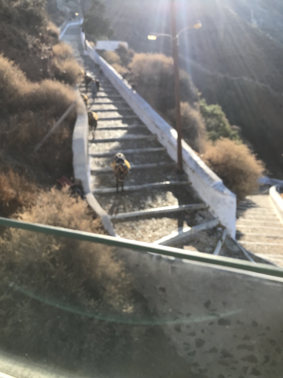 フィラの旧市街は崖の上にあり、崖の下にある旧港へ行くにはケーブルカーで行くのが一般的ですが、このフィラの階段でも行くことができます。とても歩く気が起きないような長い急な快dなんですが、観光客用にロバに乗って上り下りができます。少し危ないですが、チャレンジしても良いかもしれません。