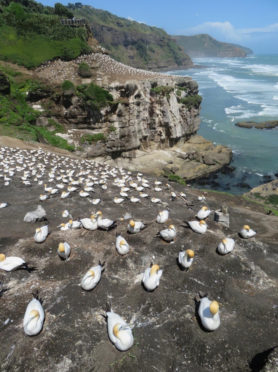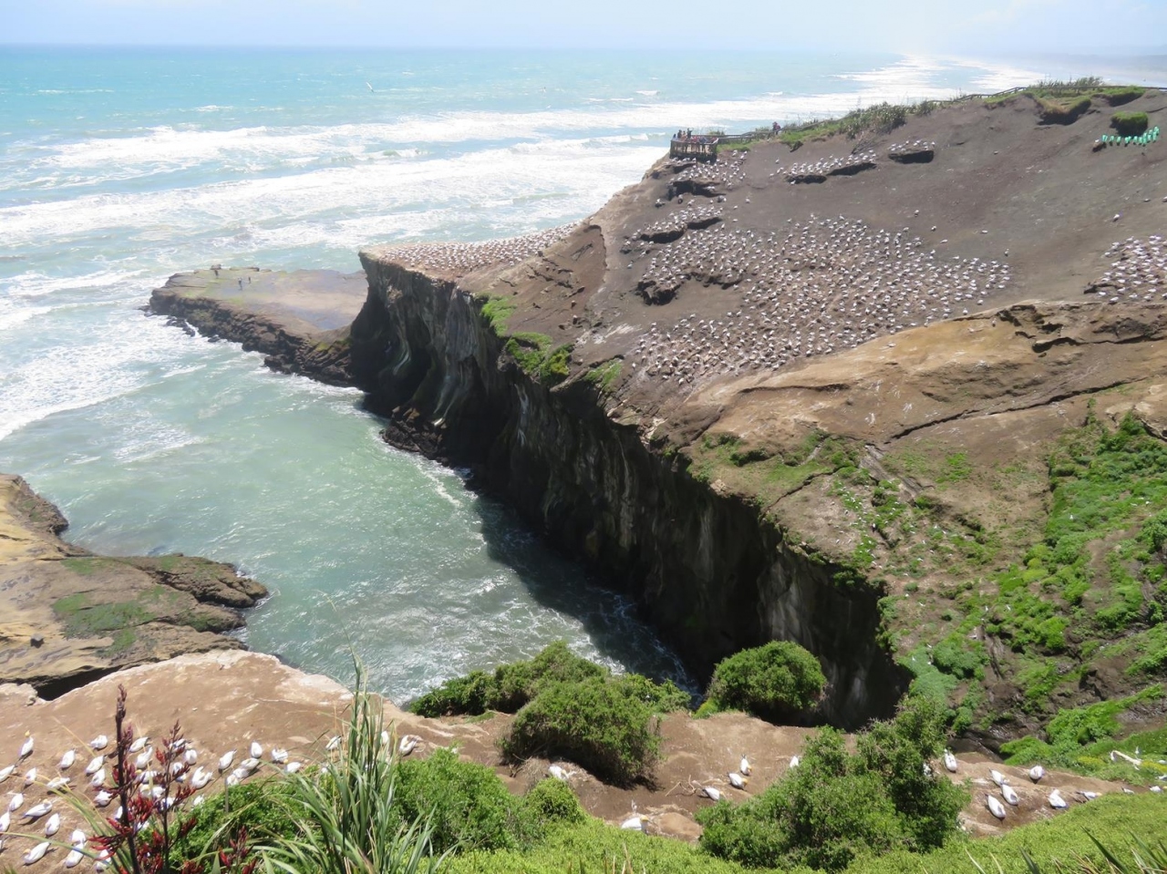 ムリワイ・ギャネット・コロニーがあるのは、オークランドから車で小一時間のムリワイ・ビーチの崖や小島。