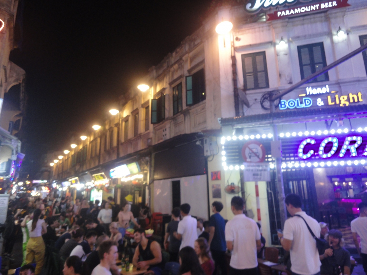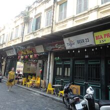 訪れる時間帯によって全く違った雰囲気となる通りです。夜に訪れたら、通りにはテーブルが並び、ビールを飲む酔っぱらい達で大混雑していて、通りを歩くことも困難でした。白人観光客が多く、ちらほらビールを売る女性の姿もありました。翌日昼頃に訪れたら、通りからテーブルは片付けられていて、閑散としていました。レモン色のレトロな建物が続き、その1階にお店が入っていたことがわかりました。