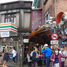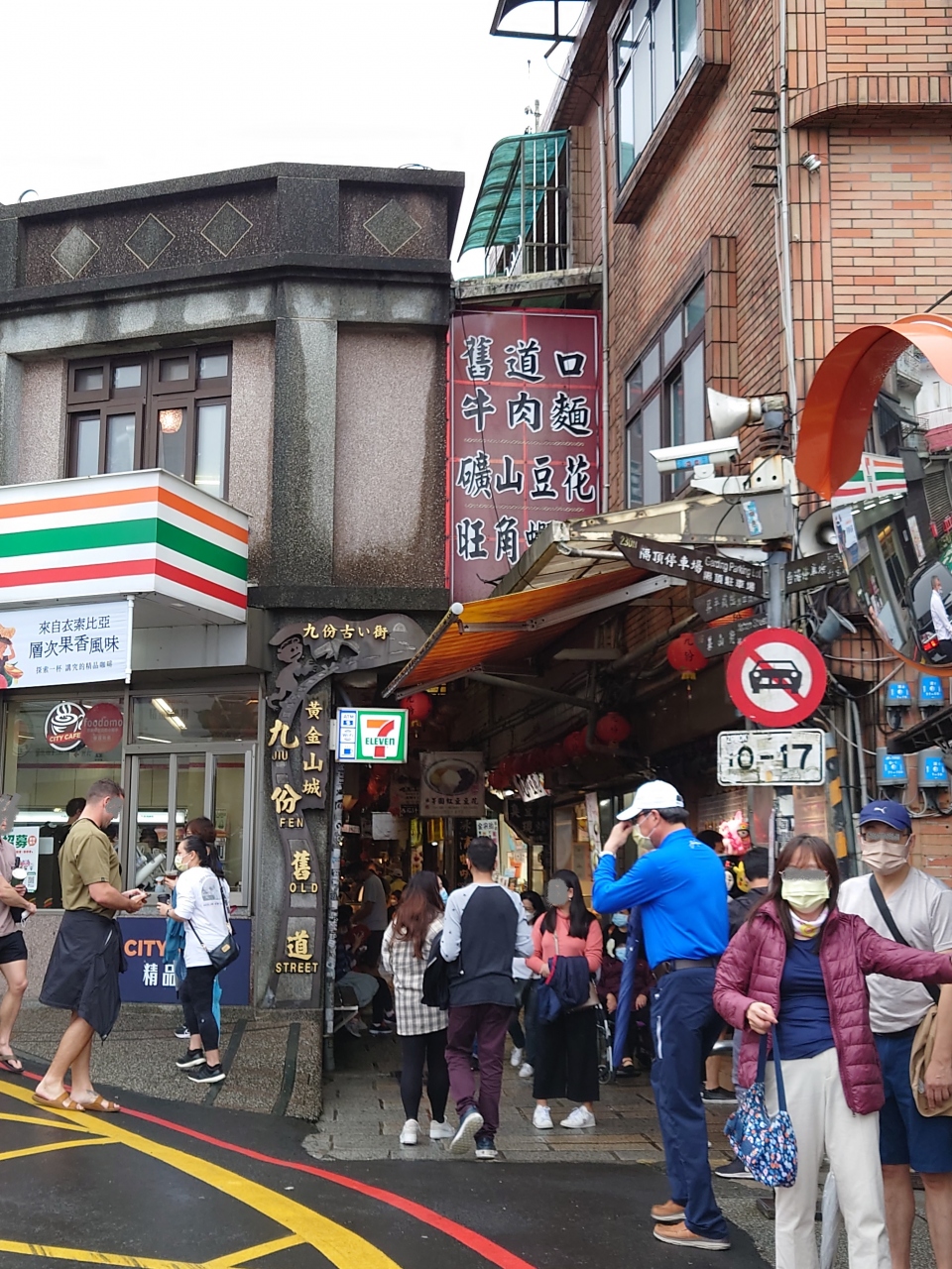 台北から九份へは、電車+バスでも行くことが出来ますが、おすすめは台北からバスです。乗換もないし、なんと言ってもわかりやすいです。バスは、965番と1062番が使えますが、965番はすぐに高速道路へ進むので早く着きます。九份のバス亭は、九份派出所か九份老街です。派出所からは心臓破りの坂を上がっていくため、おすすめ出来ません。老街で降り、進行方向に進みこのセブンイレブン脇の路地を入っていきます。