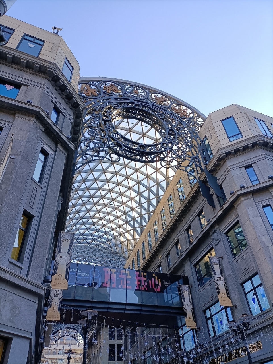 場所は、目抜き通りである南京東路と、その一本南を走る九江路、四川中路に囲まれた一等地で、4つの大型のビルを巨大なガラスの天蓋でつないで一つのまとまった空間を作っていました。添付の写真は昼間の様子ですが、夜にはクリスマスの飾りつけに灯がともり、とてもロマンチックが雰囲気になります。