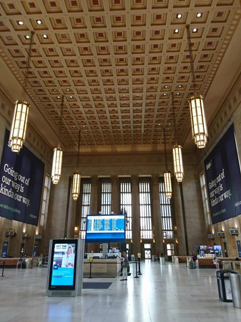 フィラデルフィアの中央駅で、陸の窓口といったところでしょうか。アムトラック等の電車を使ってフィラデルフィアに来る場合は、こちらの駅を利用することが多いかと思います。大きくて立派な駅で、天井がとても高かったです。