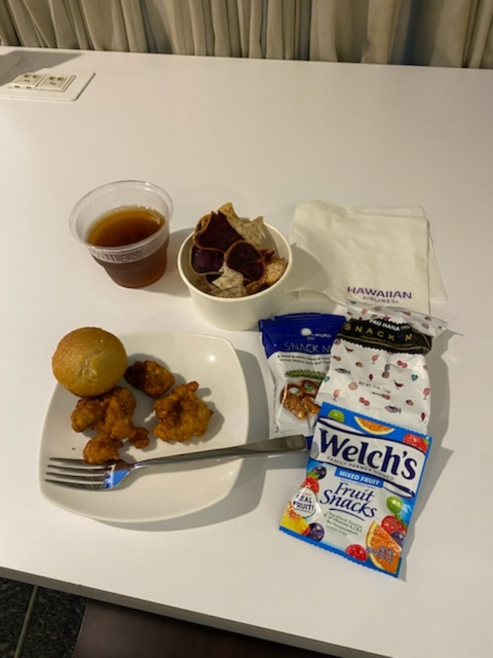 ホノルルからコナに乗り継ぐ際に利用しました。ラウンジ内は狭く、空席を見つけるのが大変でした。唐揚げ、焼きそば、デニッシュ、プリュッツェル、フルーツなどの軽食もありました。タロ芋チップスがおいしかったです。